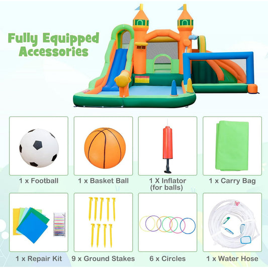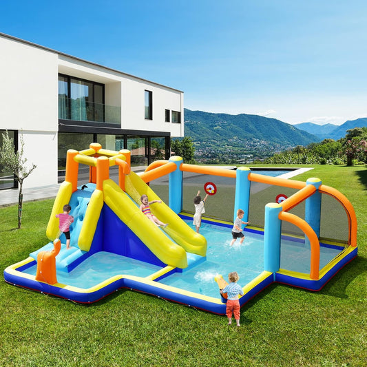 OLAKIDS Inflatable Water Slide, 7 in 1 Bounce House with 2 Slides, Climbing Wall, Splash Pool, Basketball Rim, Water Gun, Outdoor Water Park with Carrying Bag, Repairing Kit, Hose (with Air Blower)