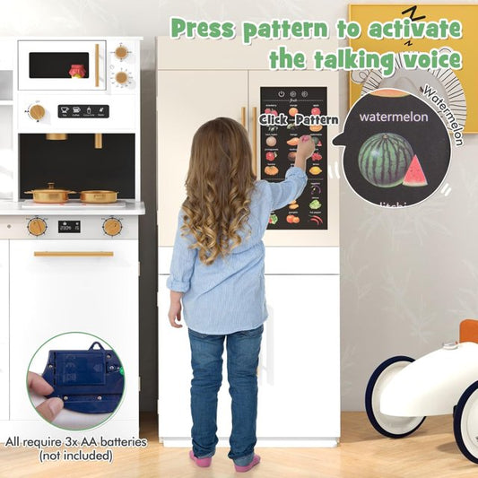 OLAKIDS Play Kitchen for Kids, 2-Piece Fridge Refrigerator Playset Combination with Electronic Interactive Alphabet Wall Chart Coffee Machine Stove Microwave, Toddler Wooden Pretend Cooking Set Gift