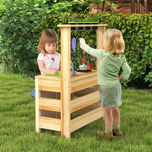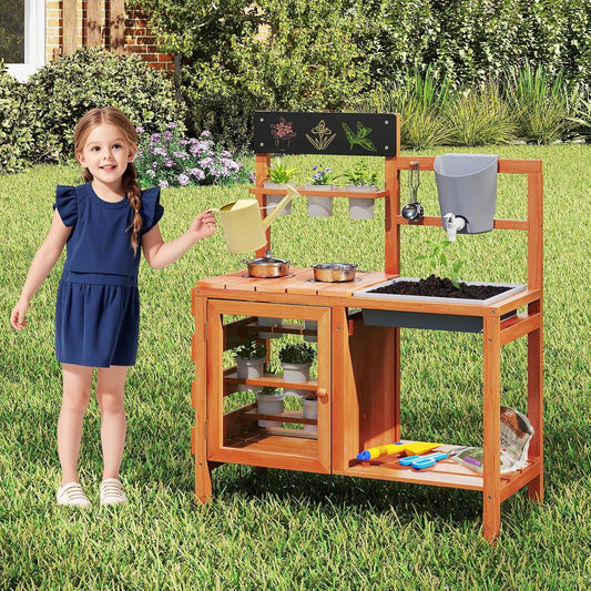 OLAKIDS Mud Kitchen for Kids Outdoor, Wooden Toddler Play Kitchen with Sink Faucet 12 Pots Chalkboard Stoves Storage Shelves, Children Potting Bench Table Pretend Toy Playset for Backyard Garden