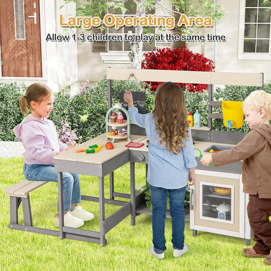 OLAKIDS Mud Kitchen, Outdoor Toys Play Kitchen with Awning Faucet Stoves Removable Sink Cooking Accessories Wooden Kids Kitchen Playset Backyard Garden Toys Gift for Boys Girls Ages 3+