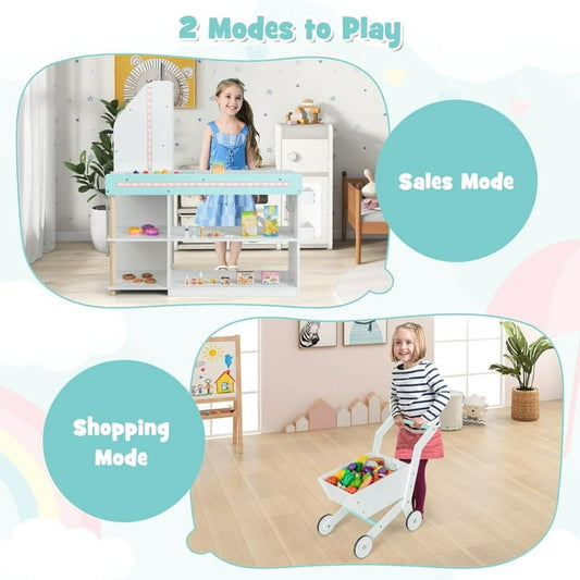 INFANS Kids Grocery Store Playset, Wooden Pretend Play Supermarket with LED Lights Manual Conveyor Belt Play Food Accessories Blackboard Cash Register, Market Stand Toy for Toddler Boys Girls