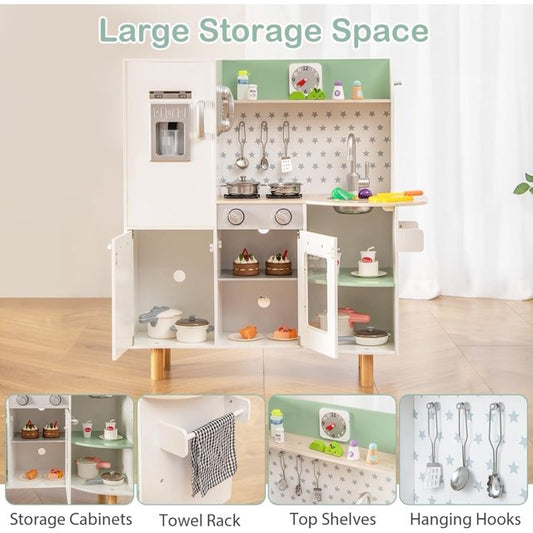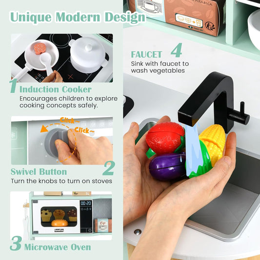 INFANS Kid Kitchen Playset, Toddler Wooden Pretend Cooking Set with Realistic Light & Sound, Stove, Sink, Microwave, Storage Cabinet, Play Kitchen Toy Set for Children Boys Girls