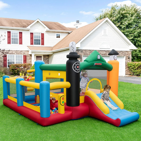 OLAKIDS Inflatable Bounce House, Train Theme Kids Jumping Castle with Slide Ball Pit Basketball Rim