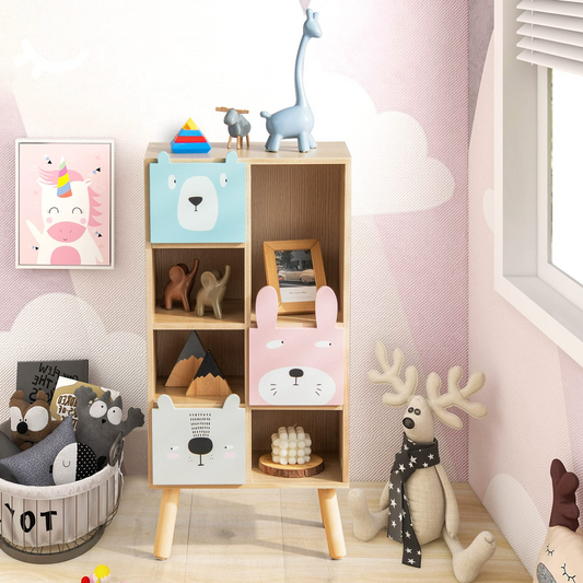 OLAKIDS Kids Bookcase Toy Storage Organizer, Children Storage Cabinet with 3 Slide Drawers and 4 Cubes