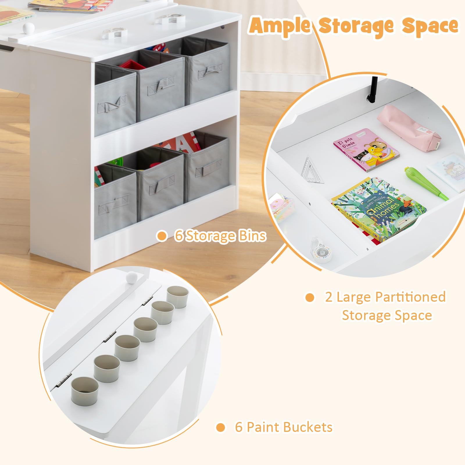 OLAKIDS 3 in 1 Kids Art Table and Chair Set, Toddler Craft Play Wood Activity Desk with 2 Chairs Storage Canvas Bins