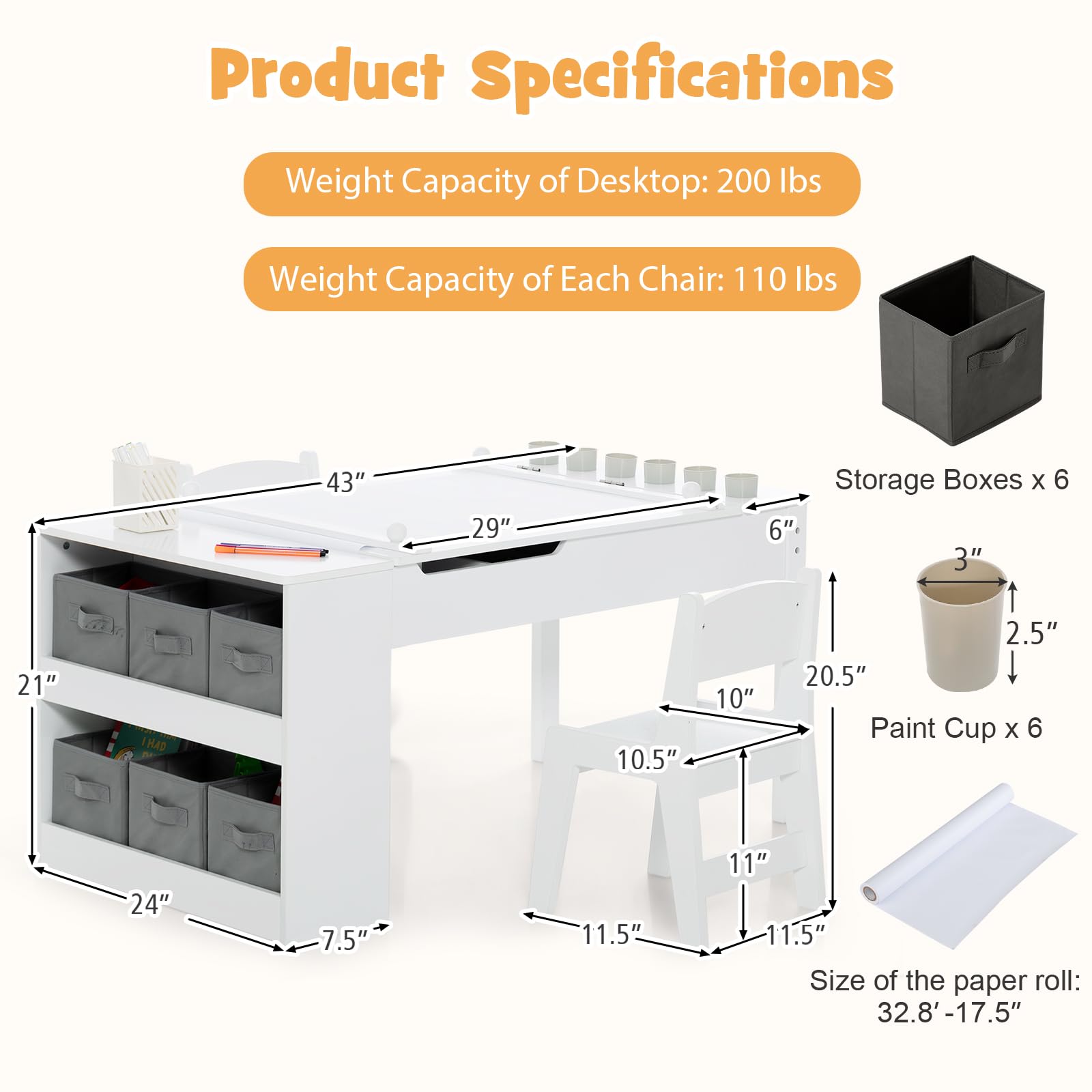 The white desk and chairs set is the perfect addition to any young artist's space. This well-crafted set comes complete with 2 chairs, 6 canvas baskets, 6 paint cups, and a roll of paper. Your child can use the table for coloring, kinetic sand, snack time, etc. The chair ensures optimal ergonomic support. Storage space under the table offer convenient storage for all kinds of supplies, keeping your child’s creative process uninterrupted. With durable materials, this art desk and chair set is built to last, surviving daily wear and tear with ease. In addition, quick assembly is possible with just a few simple steps, making setup a breeze. This versatile art desk and chair set proves ideal for home use, school projects, or classes, offering a functional and stylish solution that encourages creativity in children.