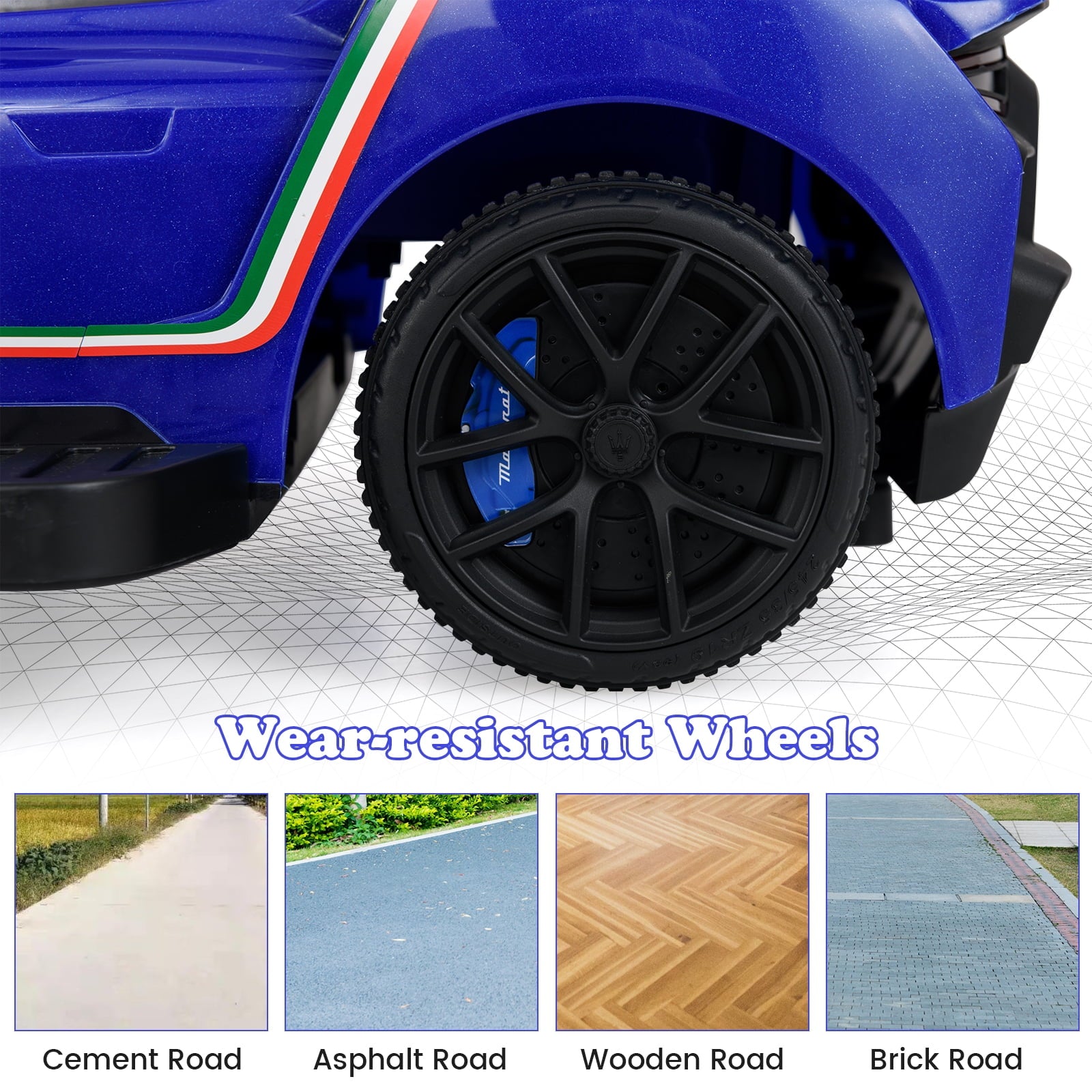 The licensed Maserati 3-in-1 ride on push car comes in 3 different configurations, including infant stroller, walking car and ride on car, allowing parents to customize to child's needs and adapt as they grow. The detachable control wheel allows parents to control the direction without affecting the steering wheel. The toddler siding car also come with convenient features, such as large hidden storage baskets, hooks for handlebars, horn and built-in music. The detachable safety bars and anti-tipping devices ensure the baby’s safety. If you're struggling to find a gift for your child, this is the perfect choice.