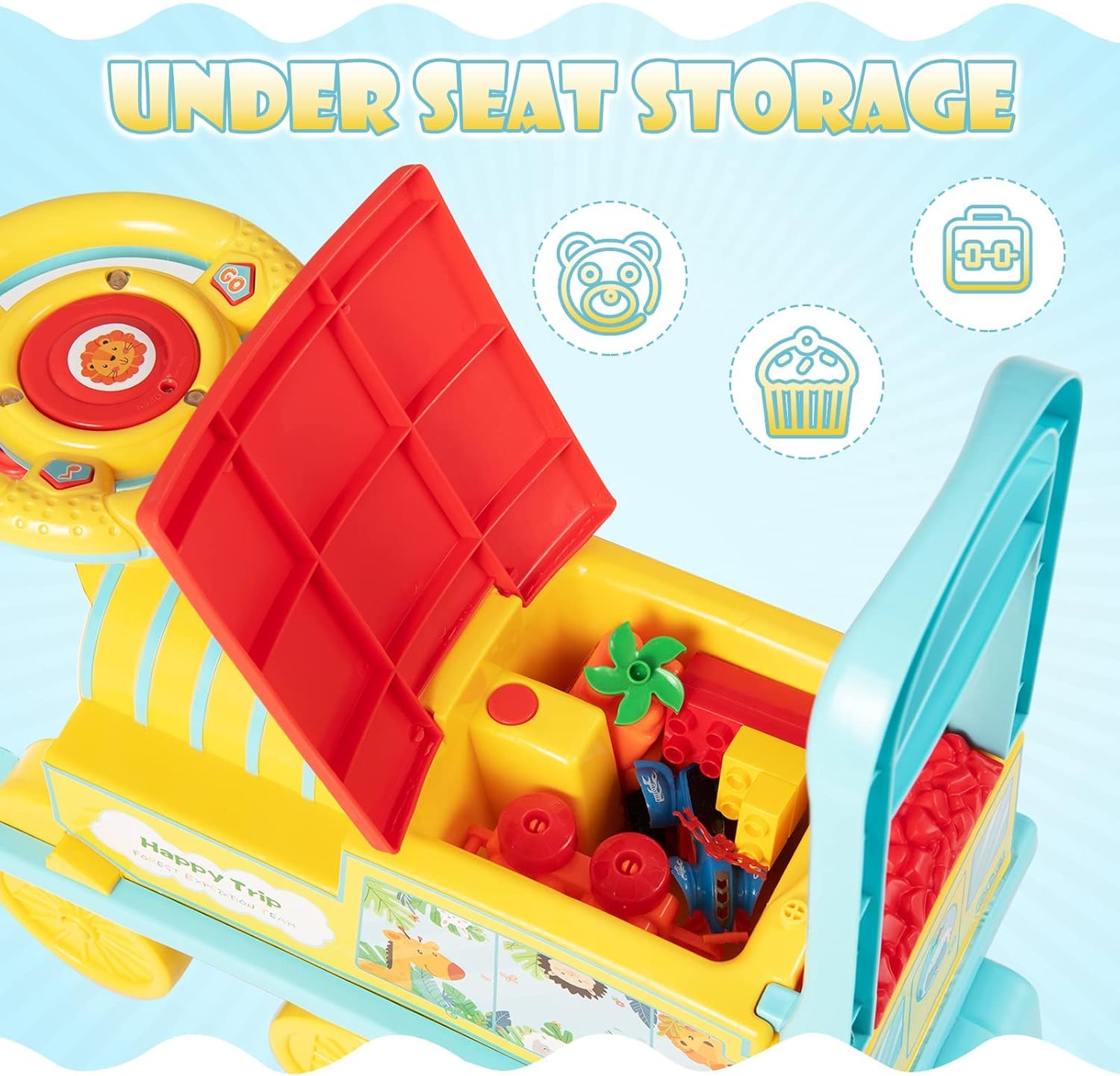 - Spacious Storage Space: There is a hidden storage space under the seat for kids' toys and snacks to free your hands when you are out