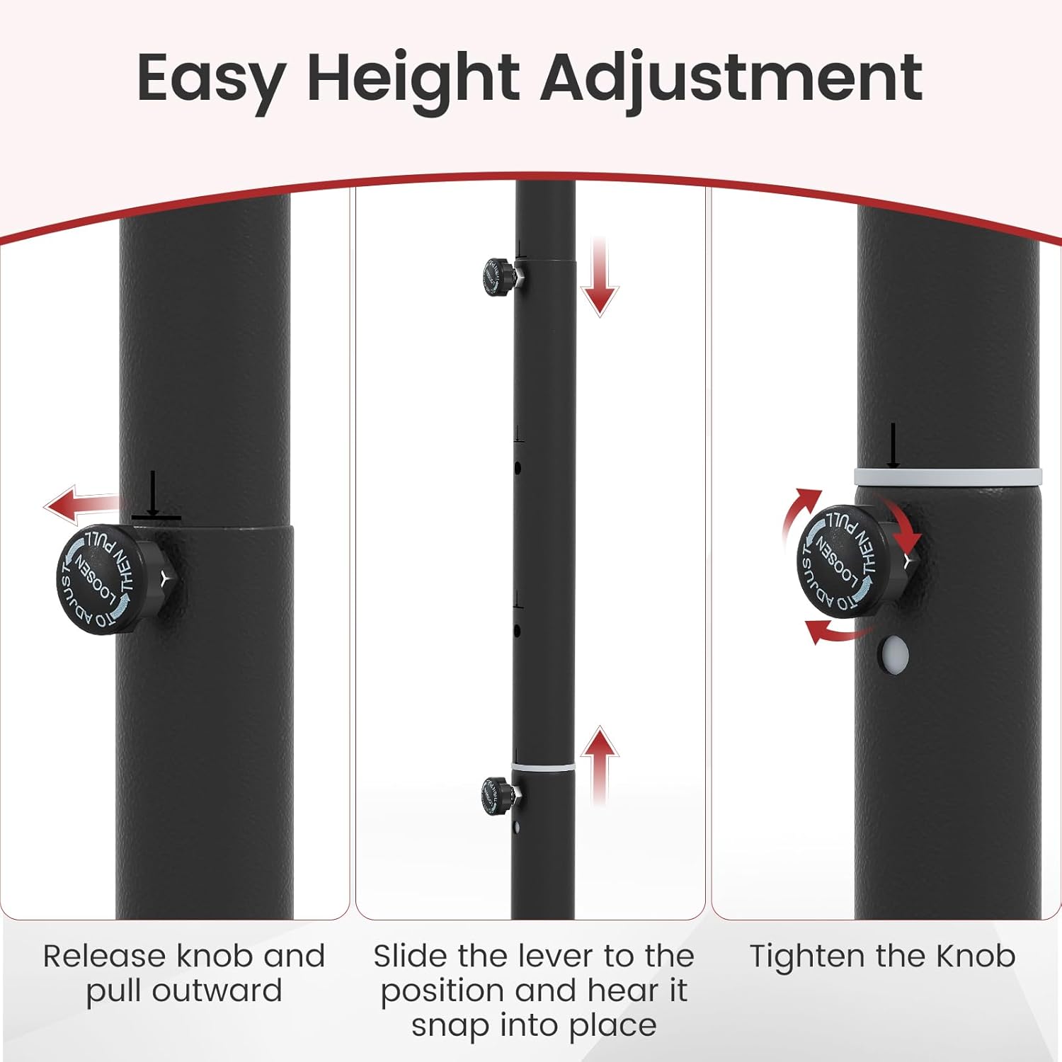 - 3.3FT-7FT Adjustable Height: The height of this basketball hoop can be adjusted between 3.3Ft to 7Ft from the floor to the rim, offering multiple options for both teens and adults. Moreover, you can adjust the height of the basketball stand in 3 steps by simply turning the knob and sliding the tube