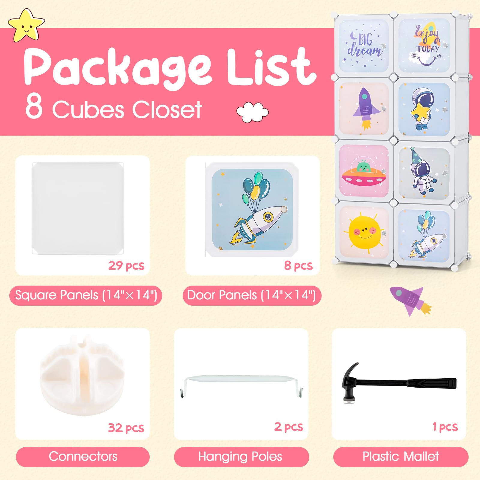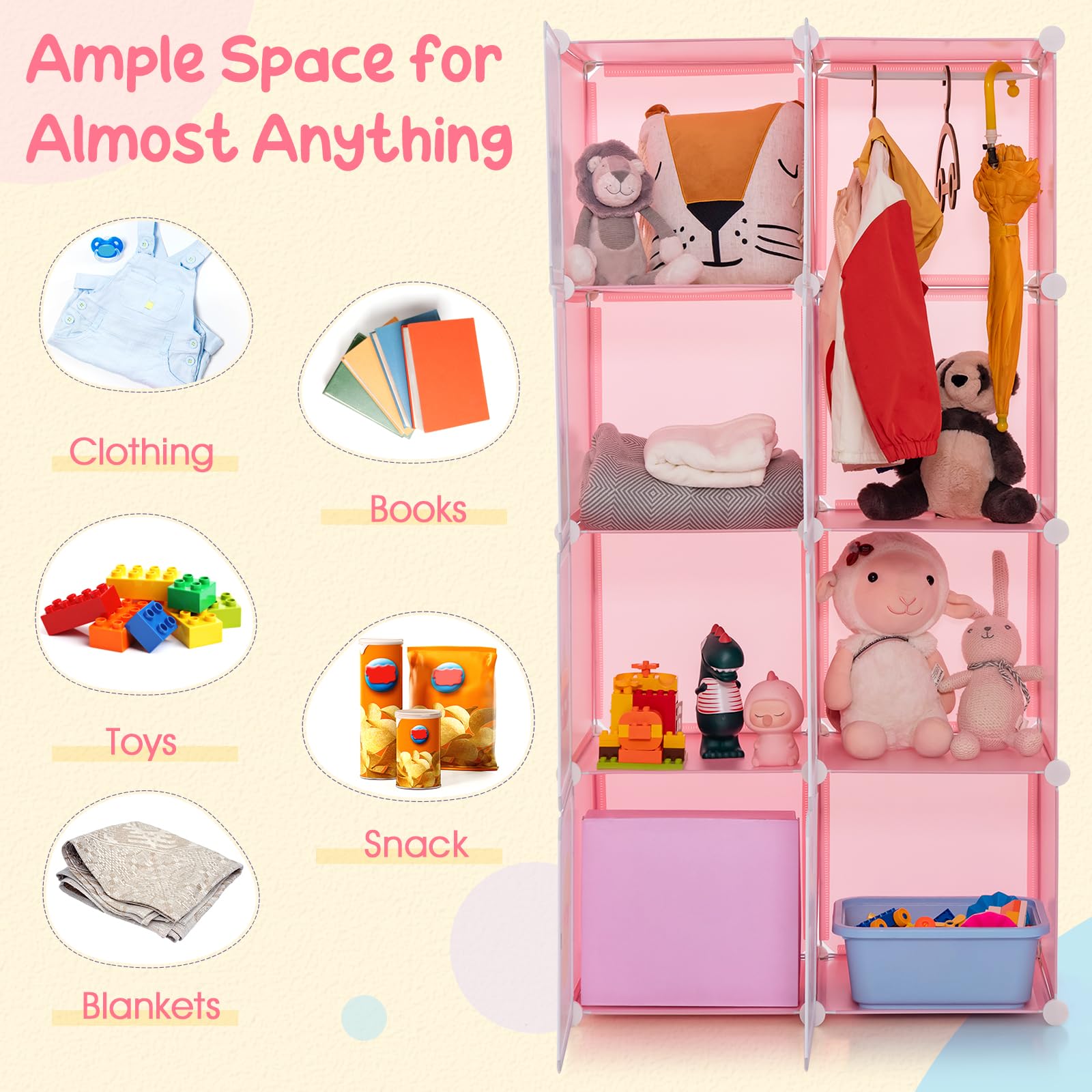 The toddler closet comes with 8 cubes and 2 extra hanging rods. Cubes can be used separately or stacked, combined into a variety of different blocks to suit your various needs. Allow you can to make customizable designs for different spaces or rooms. The size of baby clothes storage cabinet is 42"x 14"x 56", which can help you easily store a variety of children's clothes, books, toys, household items and so on. Each cube size is: 14"x 14"x 14". Fits storage bins that is smaller than 13" x 13".