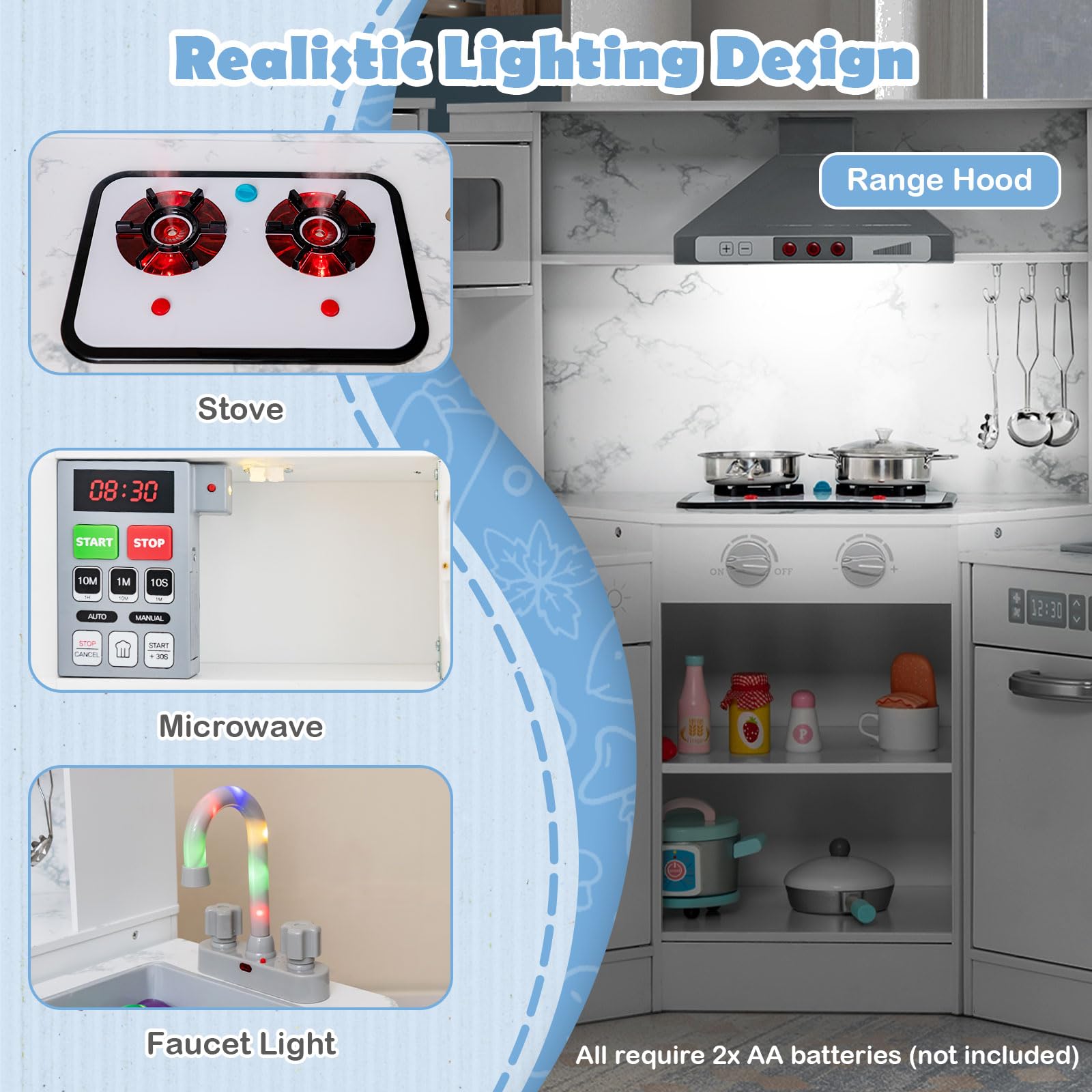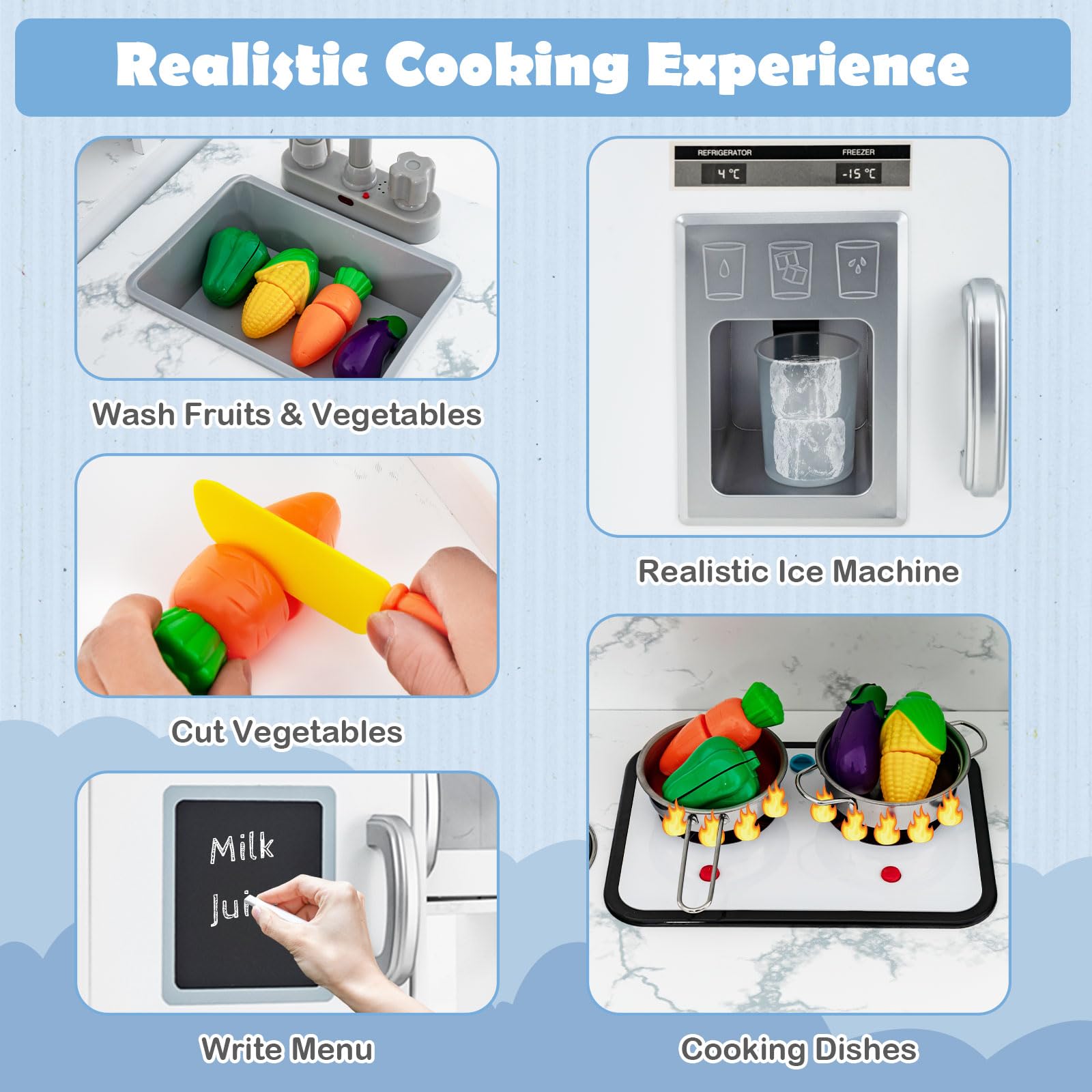 - ⭐Vivid Sound & Light: In order to give little one with an immersive cooking experience, the range hood and steam stove have realistic sound and light effects. When children turn the knob, it makes sounds and lights. Moreover, the ice maker can dispense ice cubes when children press a button. Note: 6 × AAA battery (not included).