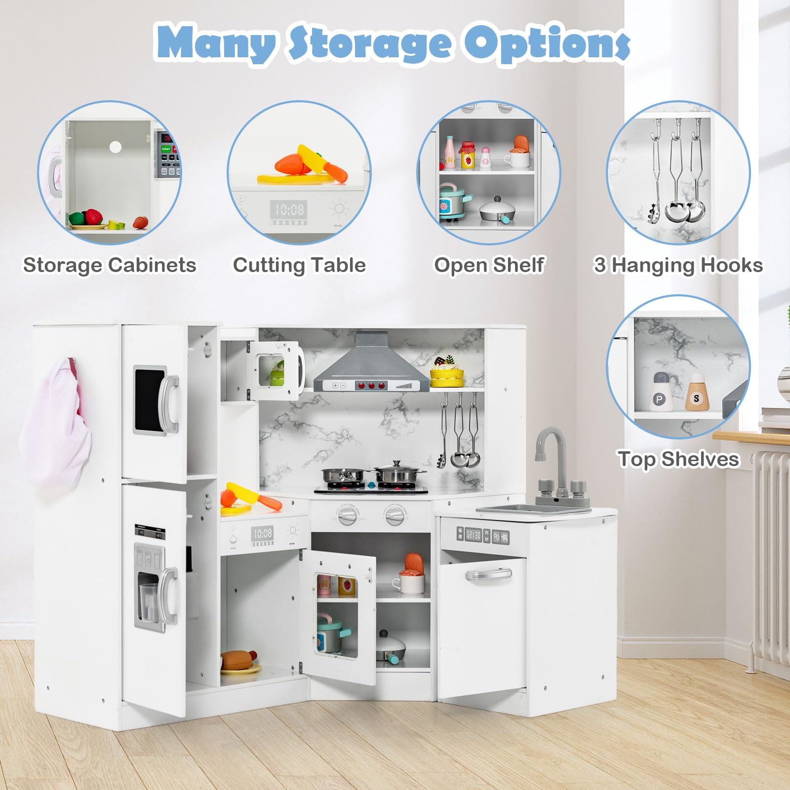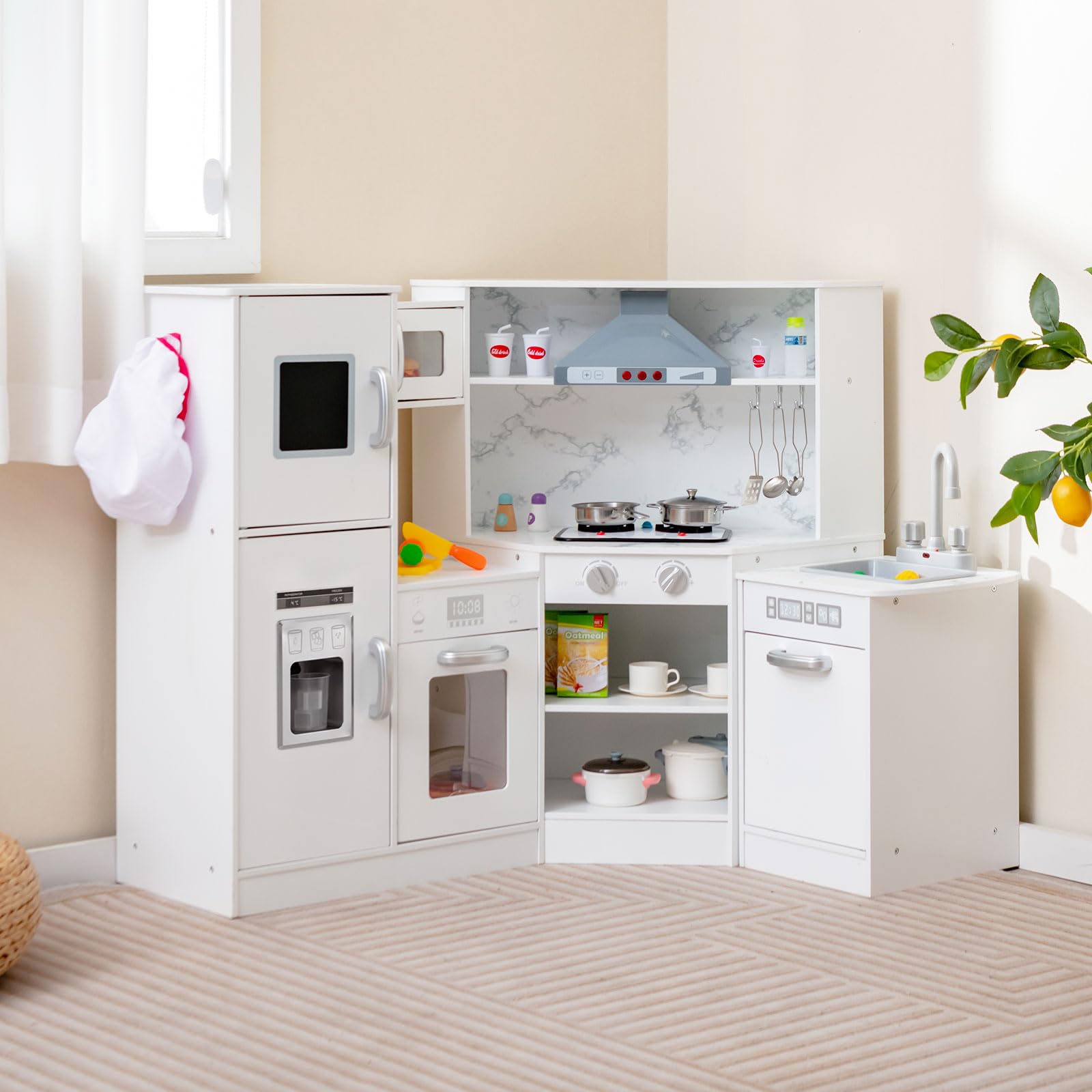 - ⭐Extreme Large Storage Space: This sophisticated kids corner cooking set comes with 5 multi-tiered cabinets with doors and corner shelves in the back. The 3 shelves above the counter provide plenty of space for the children to place the spice bottles. In addition, 2 storage baskets fit well into compartments or are used alone.