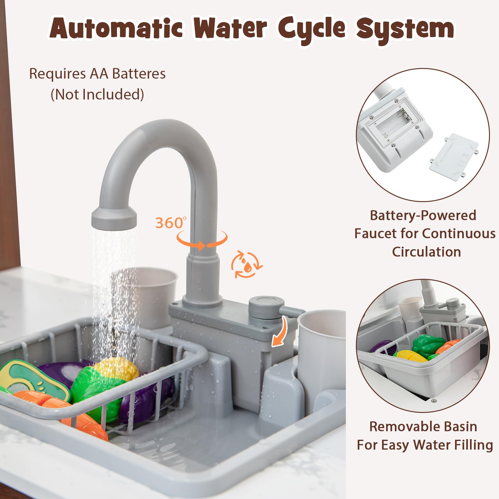 - ⭐Educational Water Circulation System: OLAKIDS play sink toys encourage kids to develop good habits from an early age. By turning the tap on and off, children can enjoy the real experience of water flowing out. The built-in water recycling system allows children to learn the importance of water conservation in the game and cultivate environmental awareness. It requires 2 AAA batteries, not included.