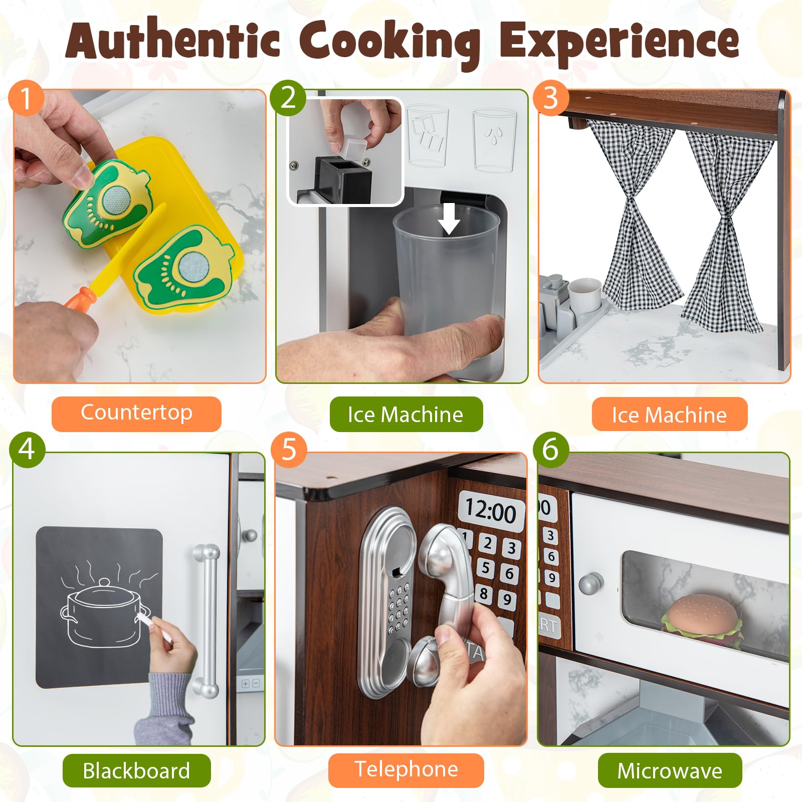 - ⭐Role-Playing Fun: This wooden pretend kitchen allows children to share the fun of exploring the kitchen with their peers by role-playing, and also provides a great opportunity for children to practice their language and social skills. The little chef can put on an apron and write the menu of the day on the blackboard. Then call the friends to eat through the telephone.