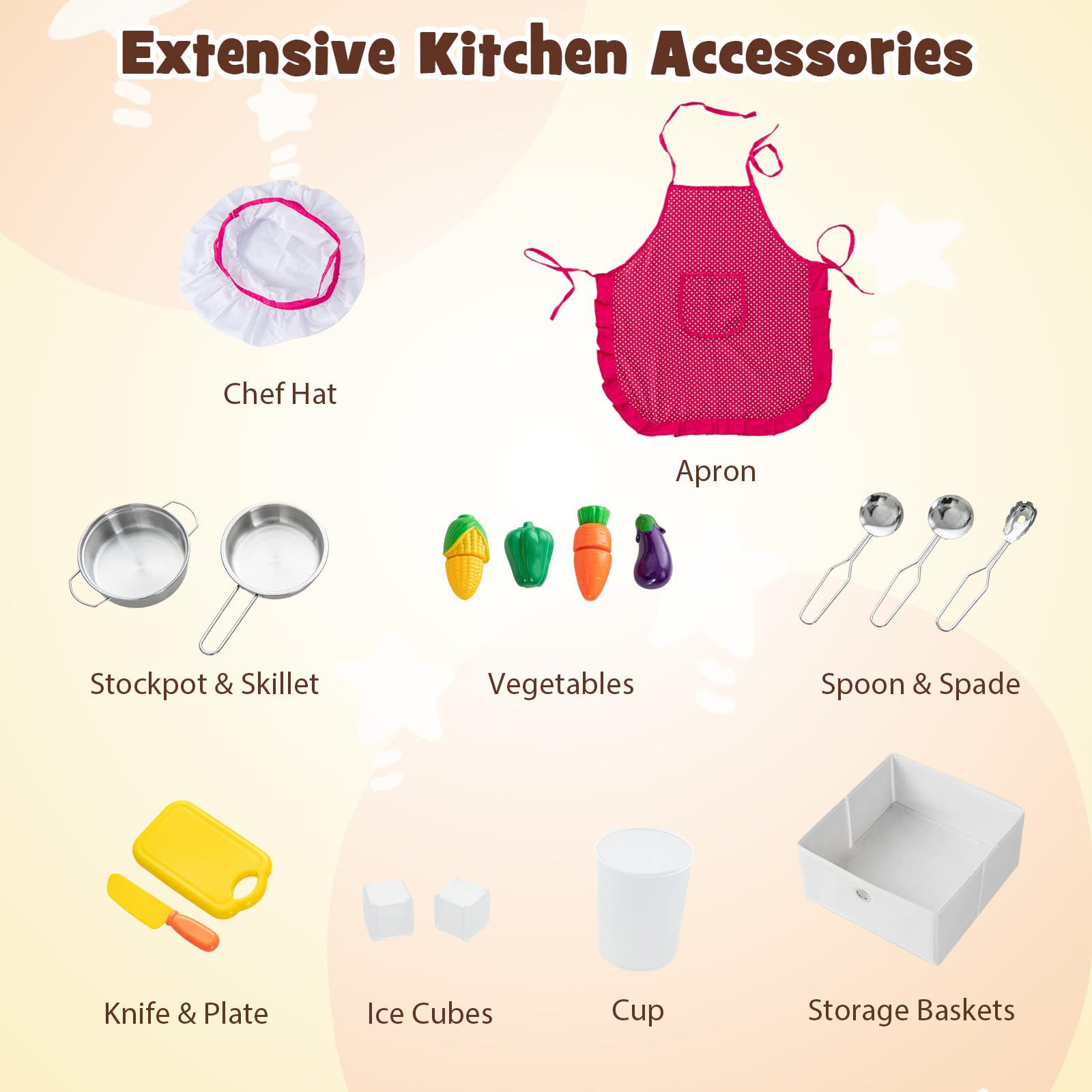 - ⭐Extreme Large Storage Space: This sophisticated kids corner cooking set comes with 5 multi-tiered cabinets with doors and corner shelves in the back. The 3 shelves above the counter provide plenty of space for the children to place the spice bottles. In addition, 2 storage baskets fit well into compartments or are used alone.