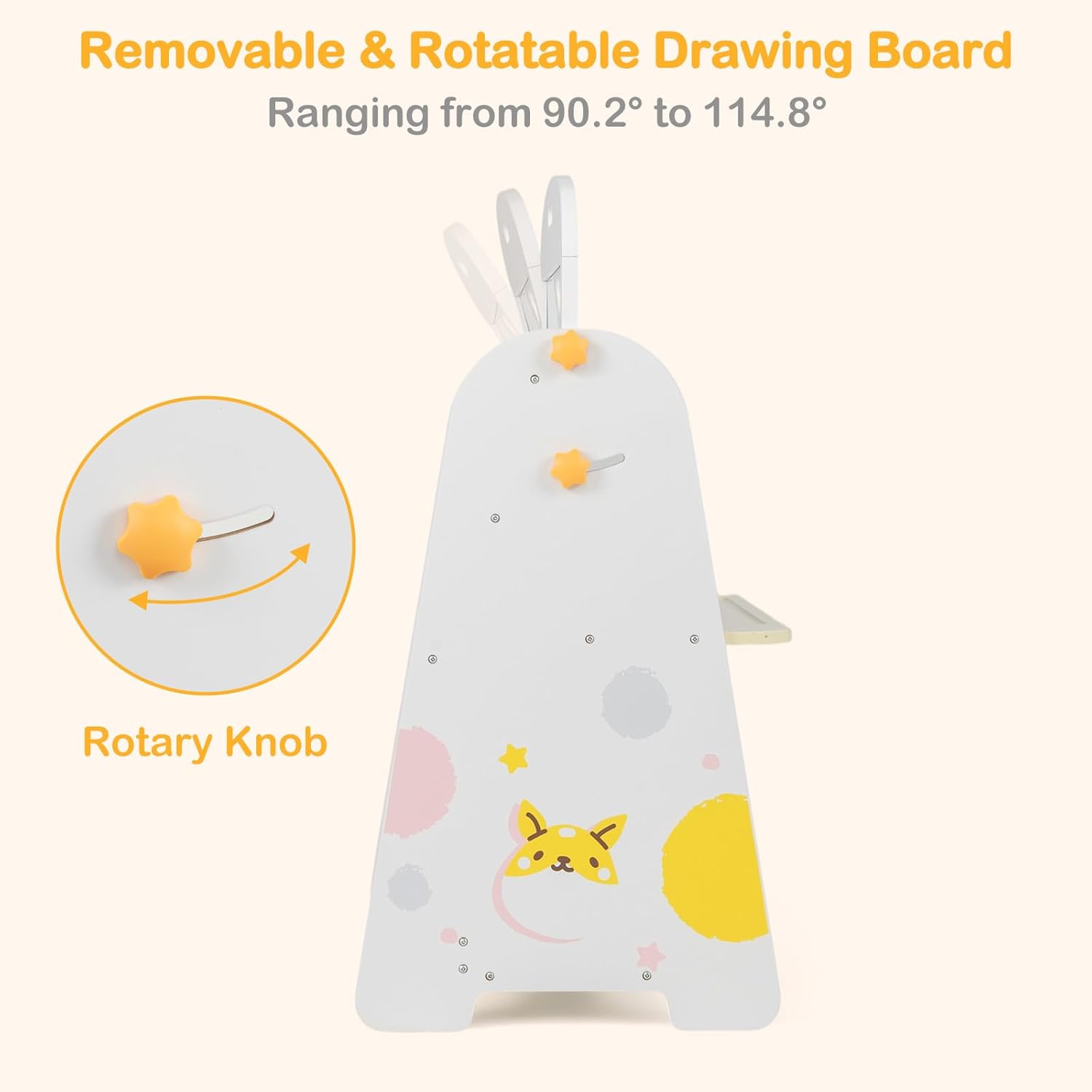 - Angle Adjustable Drawing Board: Equipped with angle-adjustable and detachable drawing board (ranging from 90.2° to 114.8°), the standing easel can be adjusted to the optimal angle for painting, providing your little artists with a comfortable space to unleash their creativity. When the angle reaches 90°, the rotatable art easel seamlessly transforms into a study desk for the kids to learn.