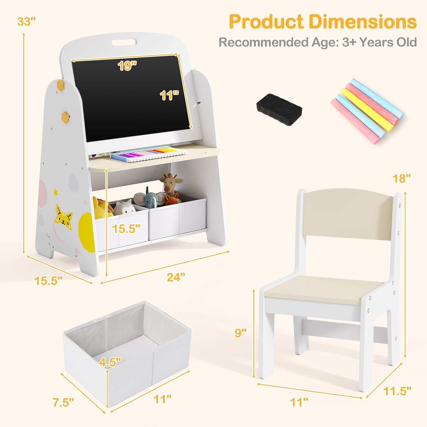- 4 in 1 Multifunctional Easel Table: Designed with a whiteboard, a blackboard, study tabletop, 2 fabric bins and 2 back shelves, this easel table for kids integrates drawing, storage and learning. The multifunctional design makes the children's drawing easel suitable for a variety of places, such as kindergarten, home, classroom, preschool, playroom and nursery.