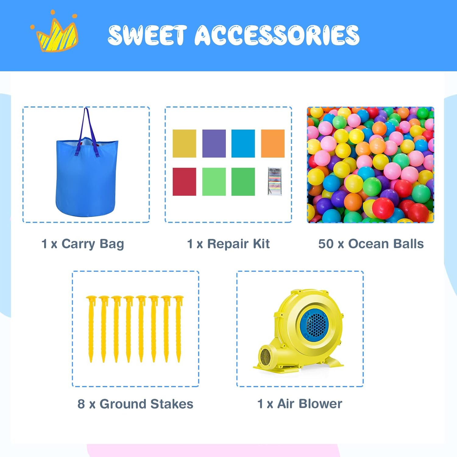 Free Accessories: This toddler inflatable bounce house comes with a carry bag for storage, a repair kit for fixing, a 680W air blower for setting up and 50pcs ocean balls for extra fun. 8 ground stakes are also provided for the stability