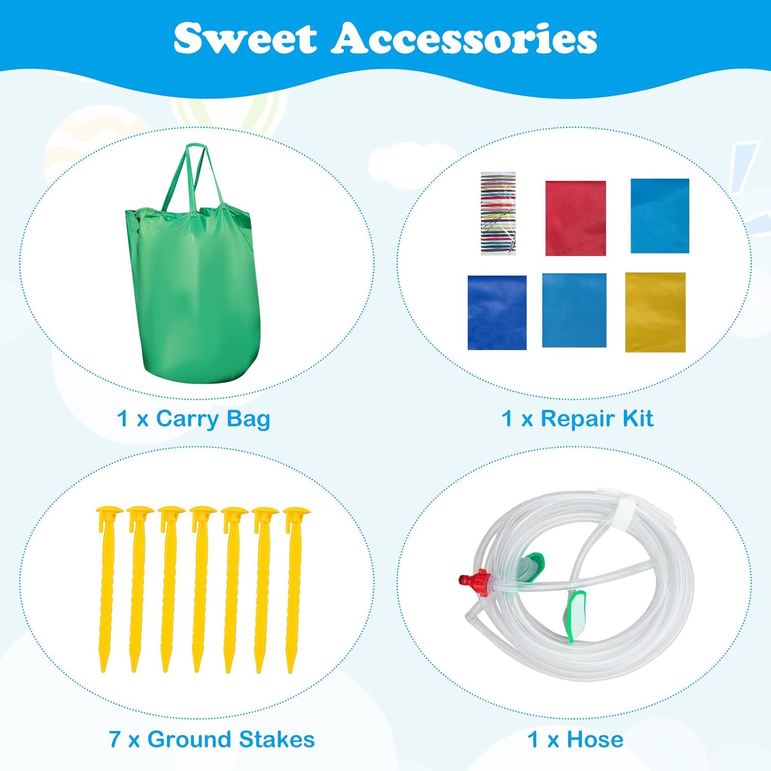 Free Accessories: This blow up water slide comes with a water hose, a carry bag for storage and a repair kit for fixing. 7 ground stakes are also provided for added stability and safety. The air blower is also included in the package