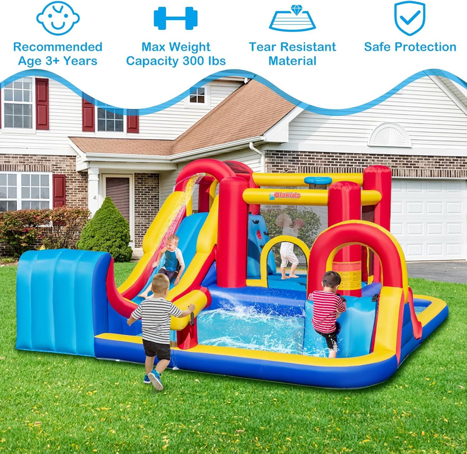 8 in 1 Bounce House Water Slide: OLAKIDS inflatable water slide combines with a long surfing slide, a bounce house with climbing wall and basketball hoop, 2 splash pools, 1 water gun and 1 small water slide to satisfy different entertainment needs. Recommended for kids 3+ years old