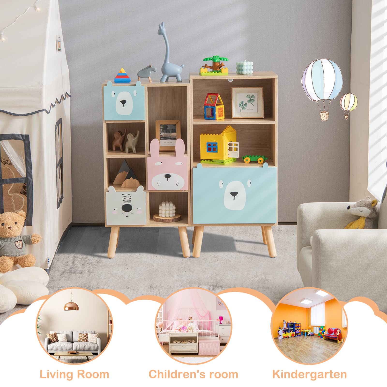 - 🐻Multi-scenario Use: The dimension of kids' bookshelves is 16" x 11.5" x 33", with a top plate that can hold 44 pounds and each compartment and drawer can hold 11 pounds of items. Display cabinet are suitable for use in bedrooms, children's rooms, playrooms, study rooms, kindergartens and other scenarios.
