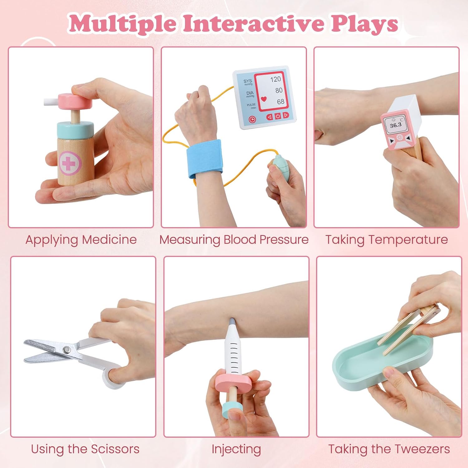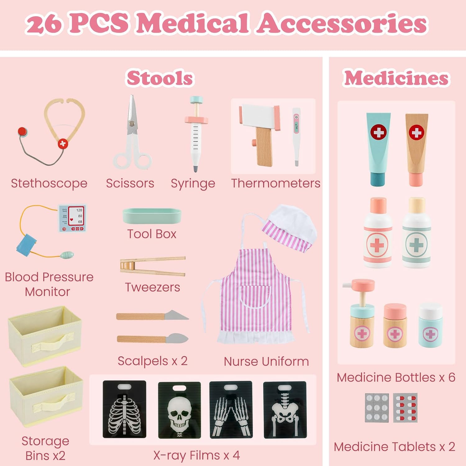 - Multiple Safety Features: Crafted from high-quality wood and water-based paint, this toy medical kit is free of irritating odors. All accessory edges are rounded to prevent scratches from sharp corners.