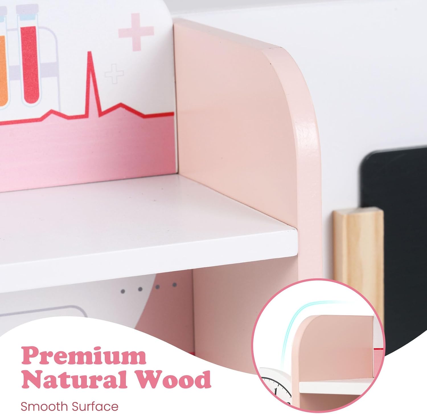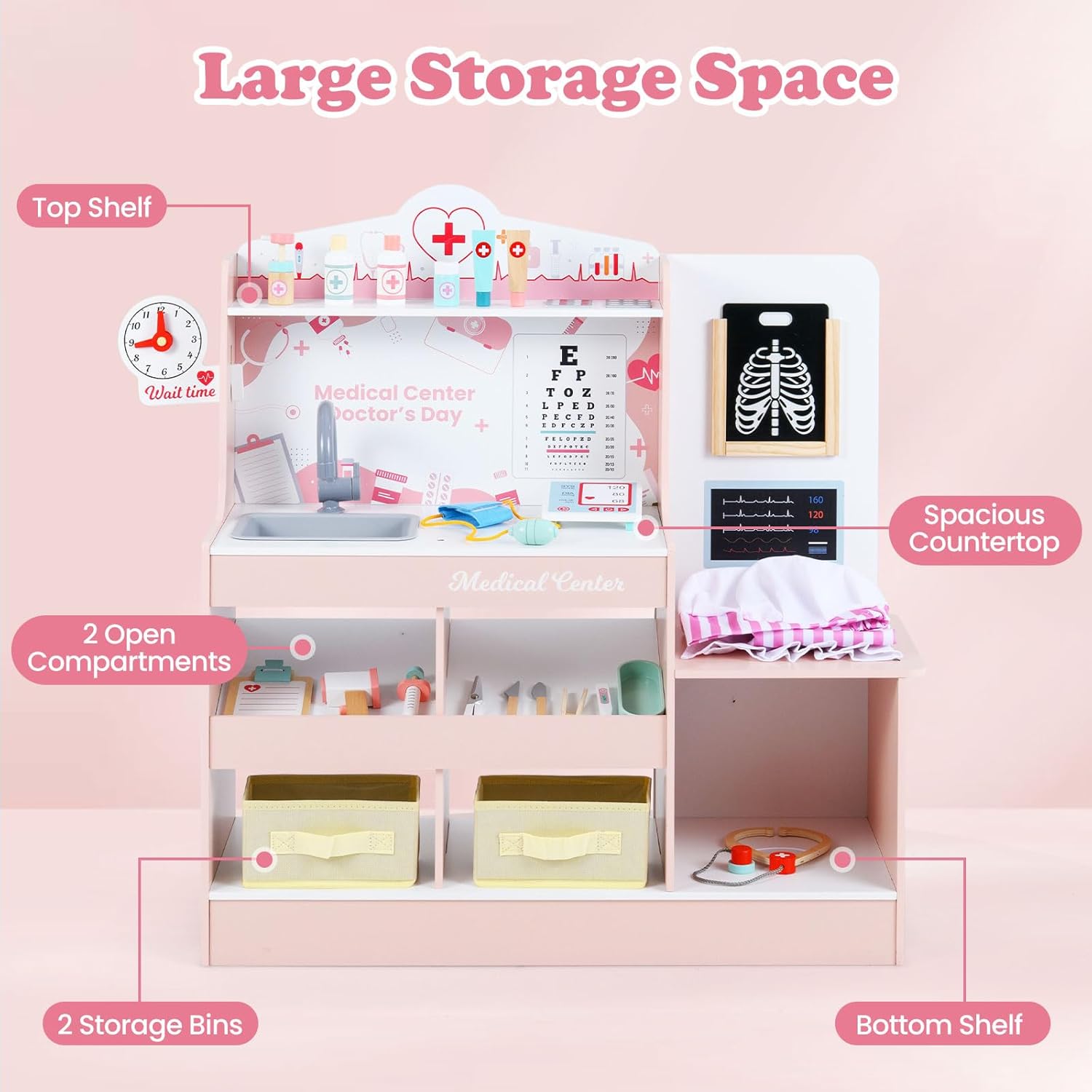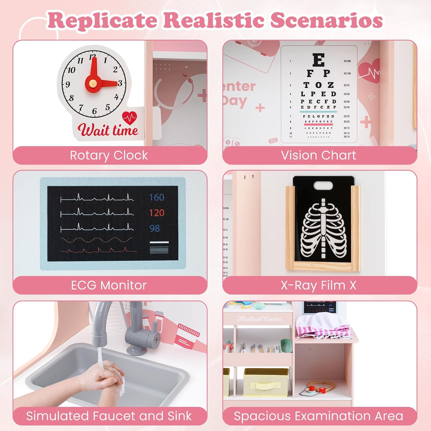 - 26 Medical Accessories: The role-play medical toy includes nurse uniform, ECG monitor and X-ray films, along with a spacious examination area, a simulated faucet, and a sink. Whether kids play alone or interact with peers, they can enjoy long-lasting fun. It’s perfect for kids who aspire to be doctors or nurses.