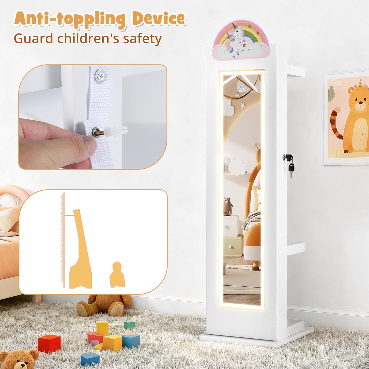 OLAKIDS Kids Jewelry Armoire Cabinet, 360° Swivel Lockable Standing Makeup Organizer with Interior Lights, Rotatable Full-Length LED Vanity Mirror with Foldable Fabric Drawer for Girls