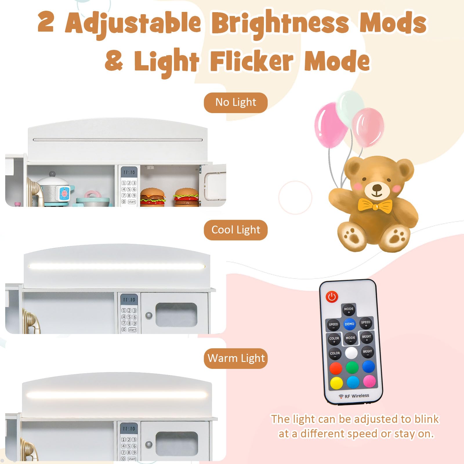 - 🌮Adjustable Lighting Effects: OLAKIDS kids kitchen playset comes with a luxurious LED light strip that adjusts 2 light colors, 7 dynamic modes, 5 brightness and 10 speed modes. With the included remote control, kids can easily switch between different lighting options and customize the ambiance of their cooking . Note: 3 AA batteries needed (not included).