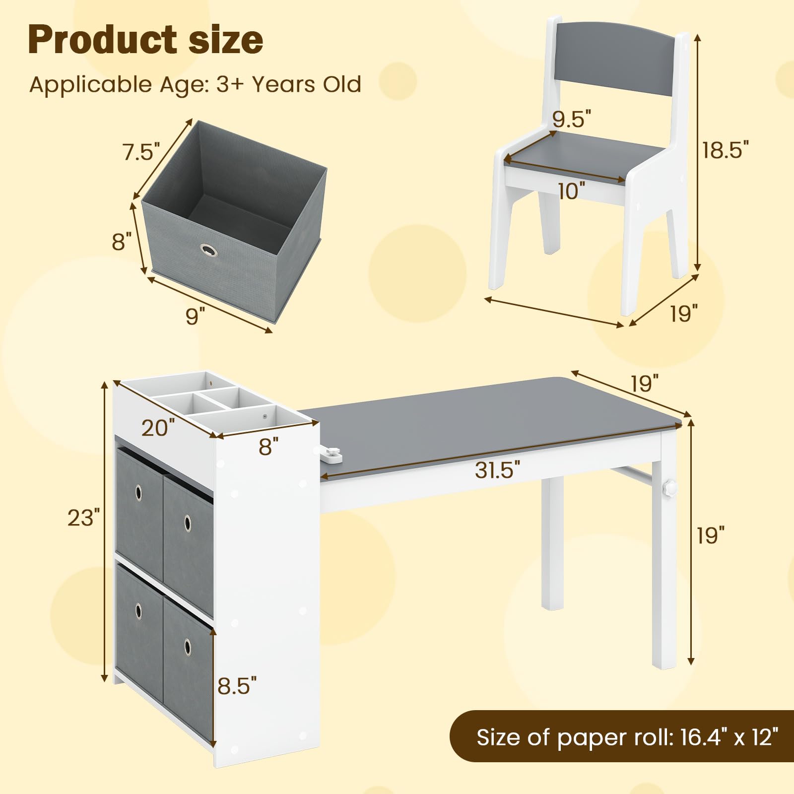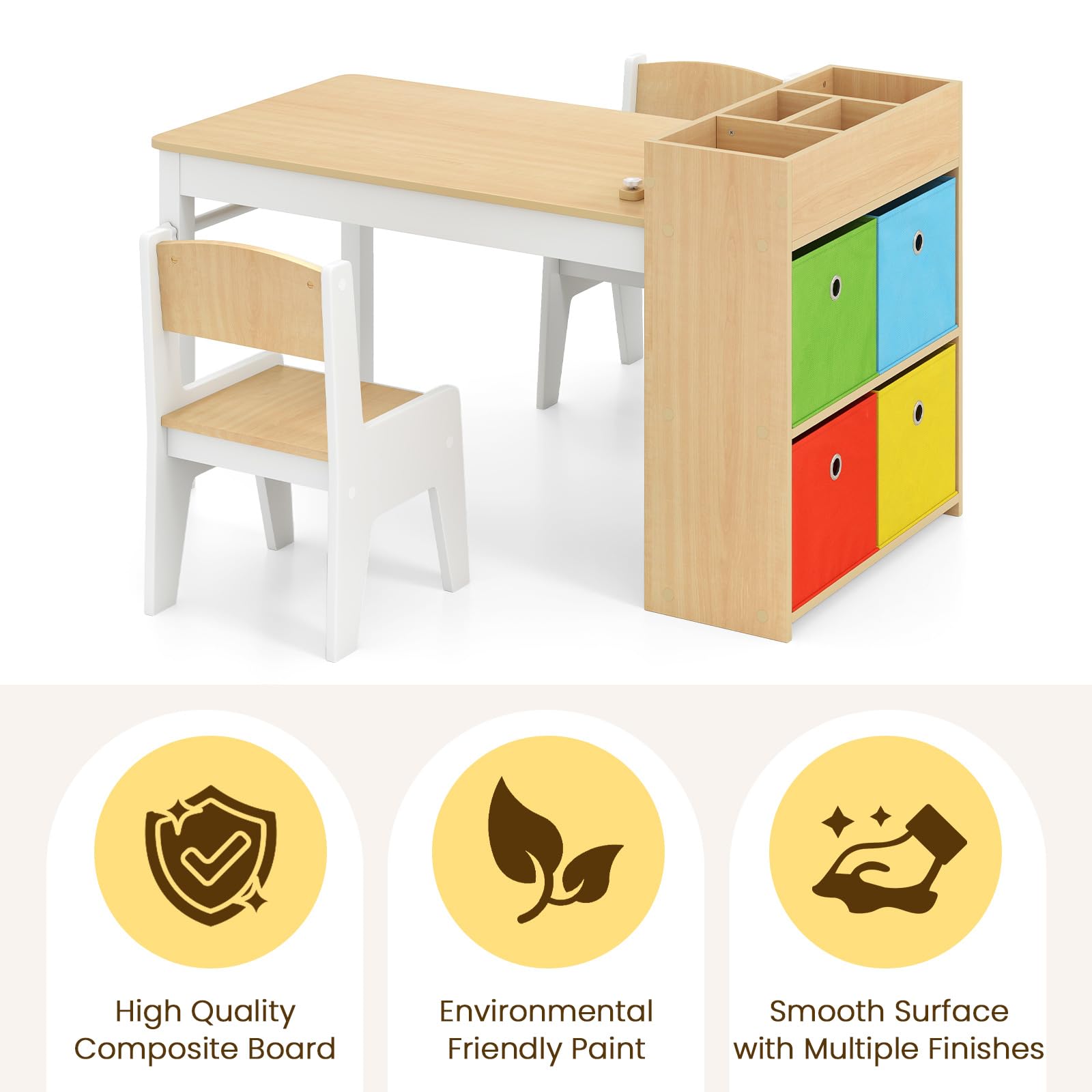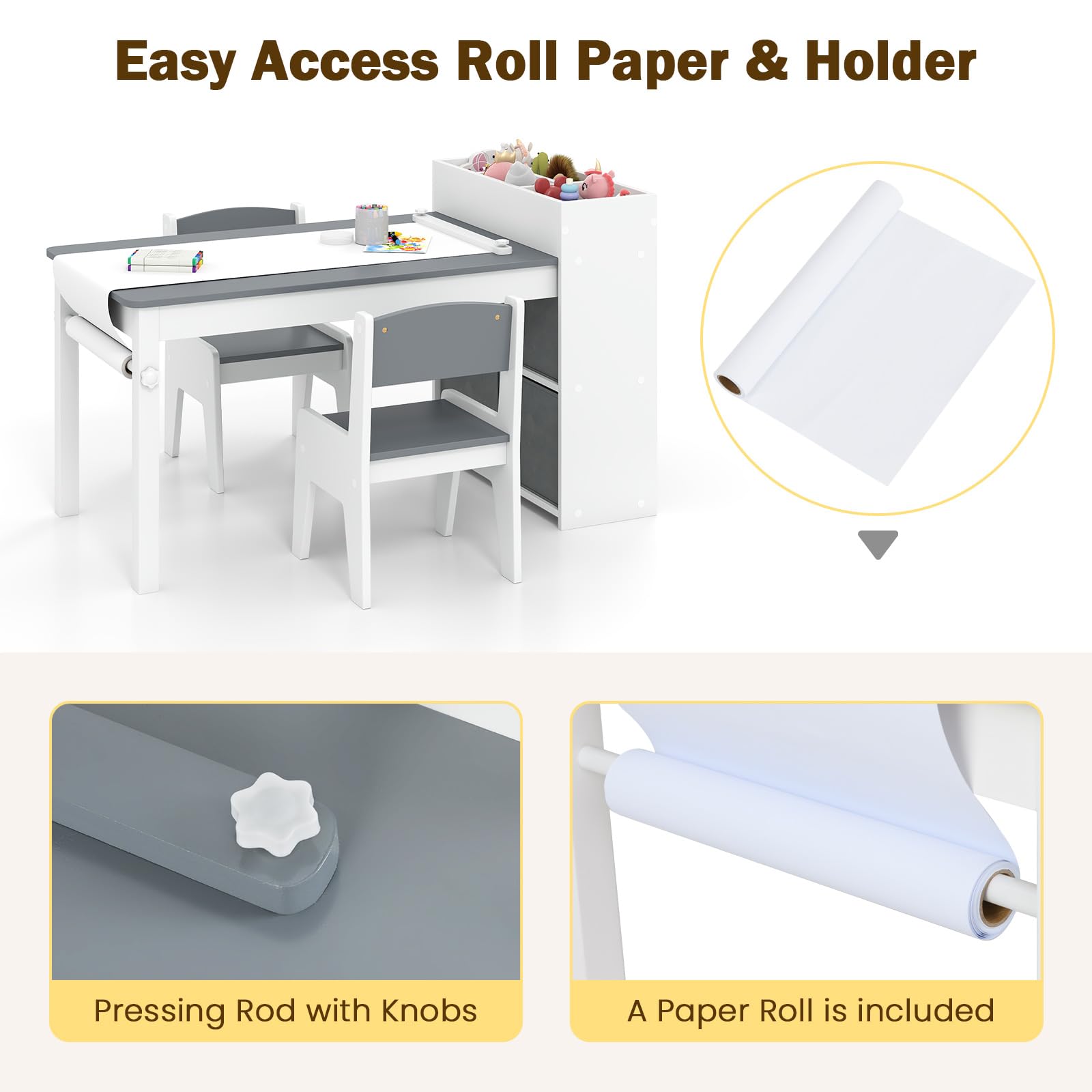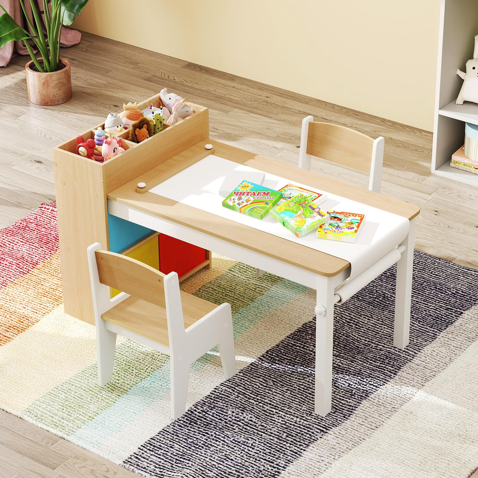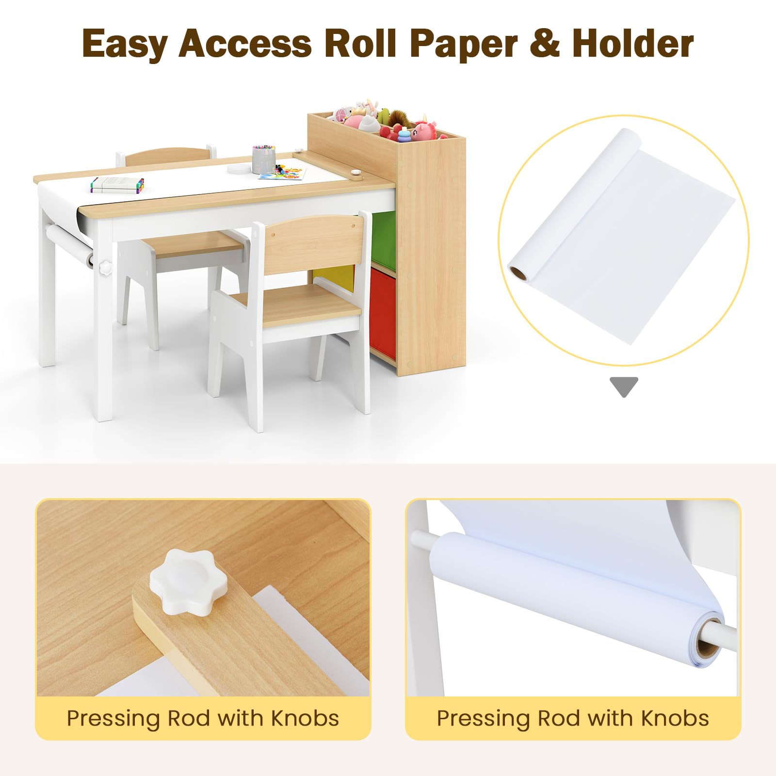 OLAKIDS Kids Table and Chair Set, Toddler Art Craft Play Wood Activity Desk with 2 Chairs 4 Storage Canvas Bins Paper Roll
