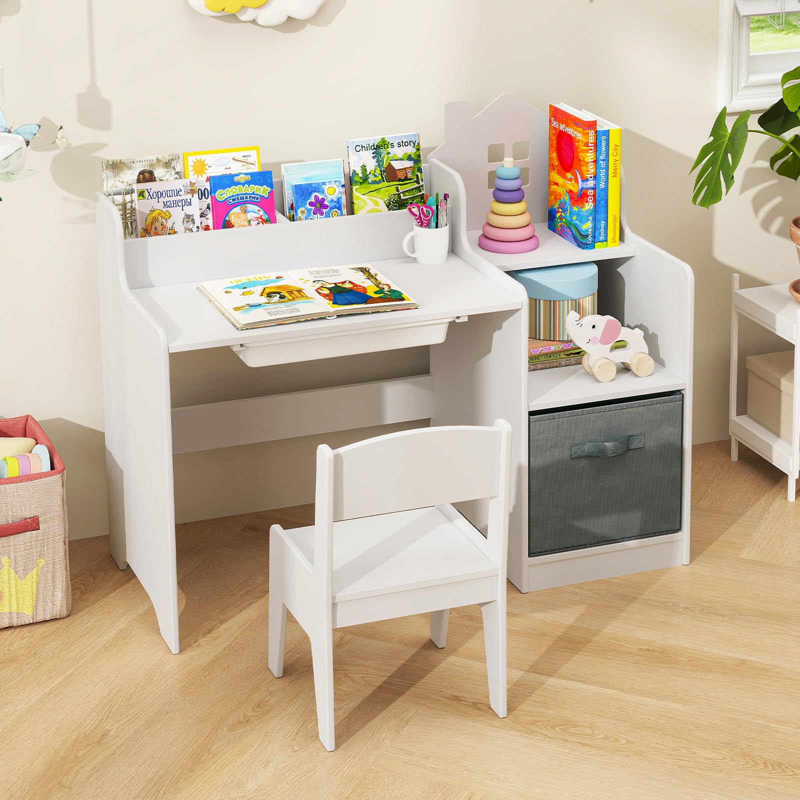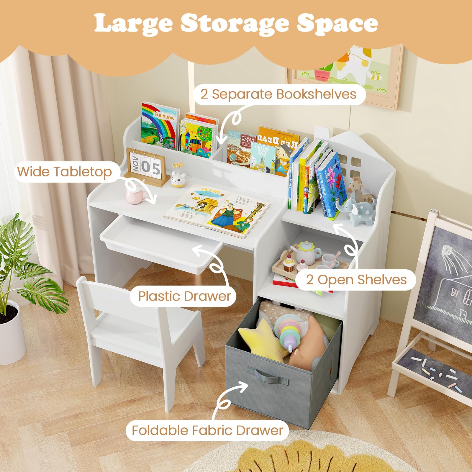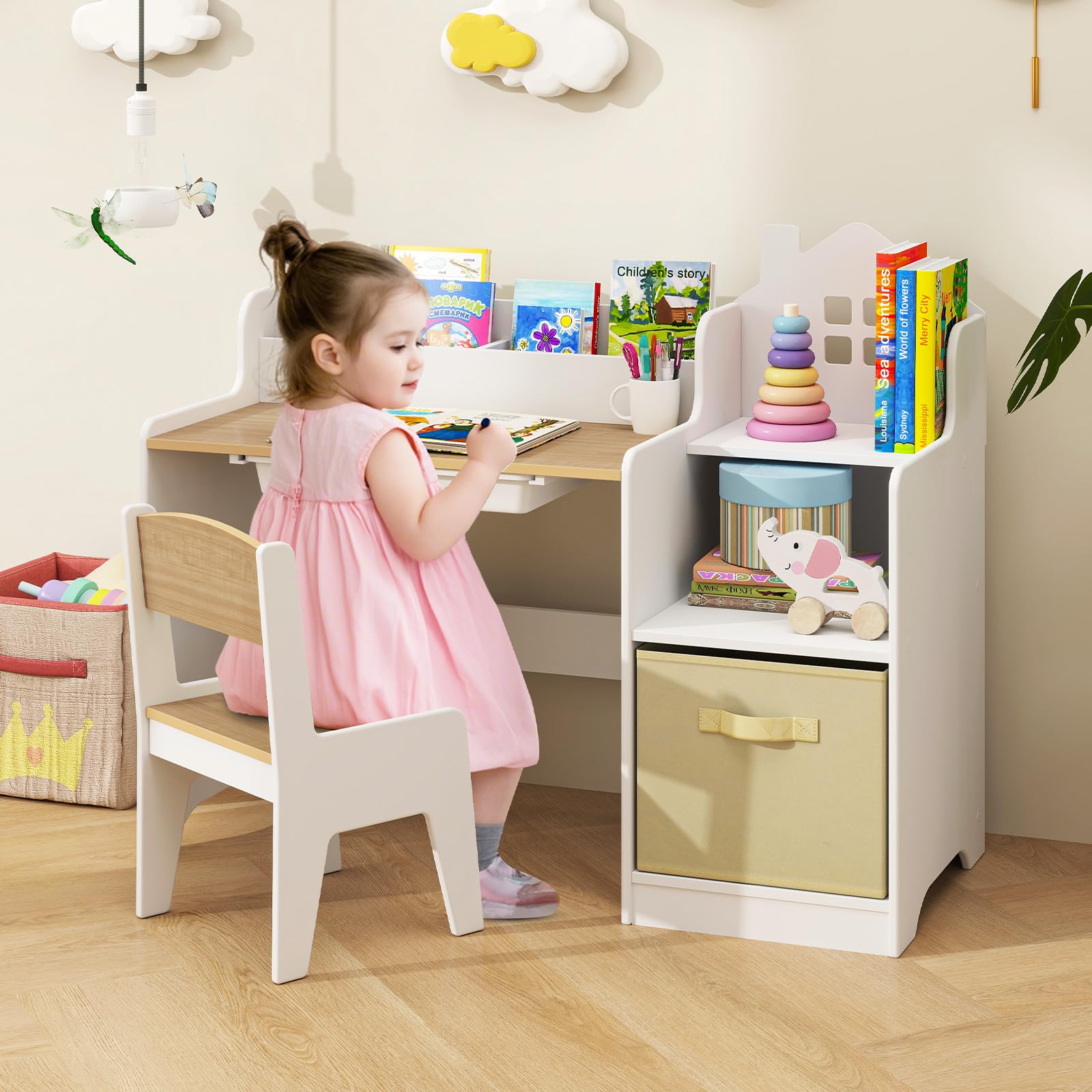 - Smart Storage Solution: OLAKIDS art desk and chair set includes 2 side shelves, 2 compartments, 1 drawer and 1 canvas baskets , providing perfect storage for pens, pencils, markers, brushes, and other supplies. Not only promoting a clutter-free environment, but also cultivate children's storage ability.