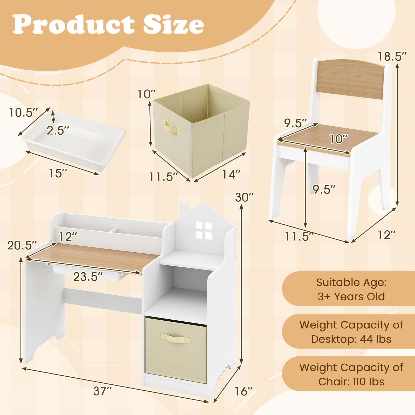 - Size Detail: This kids art table set includes 1 table and 2 chairs that are specially designed for kids ages 3+ years; Table Dimension 37" x 16" x 30" (L x W x H), capacity is 44 lbs, Chair Dimension 11.5" x 12" x 18.5" (L x W x H) and the capacity is 110 lbs.
