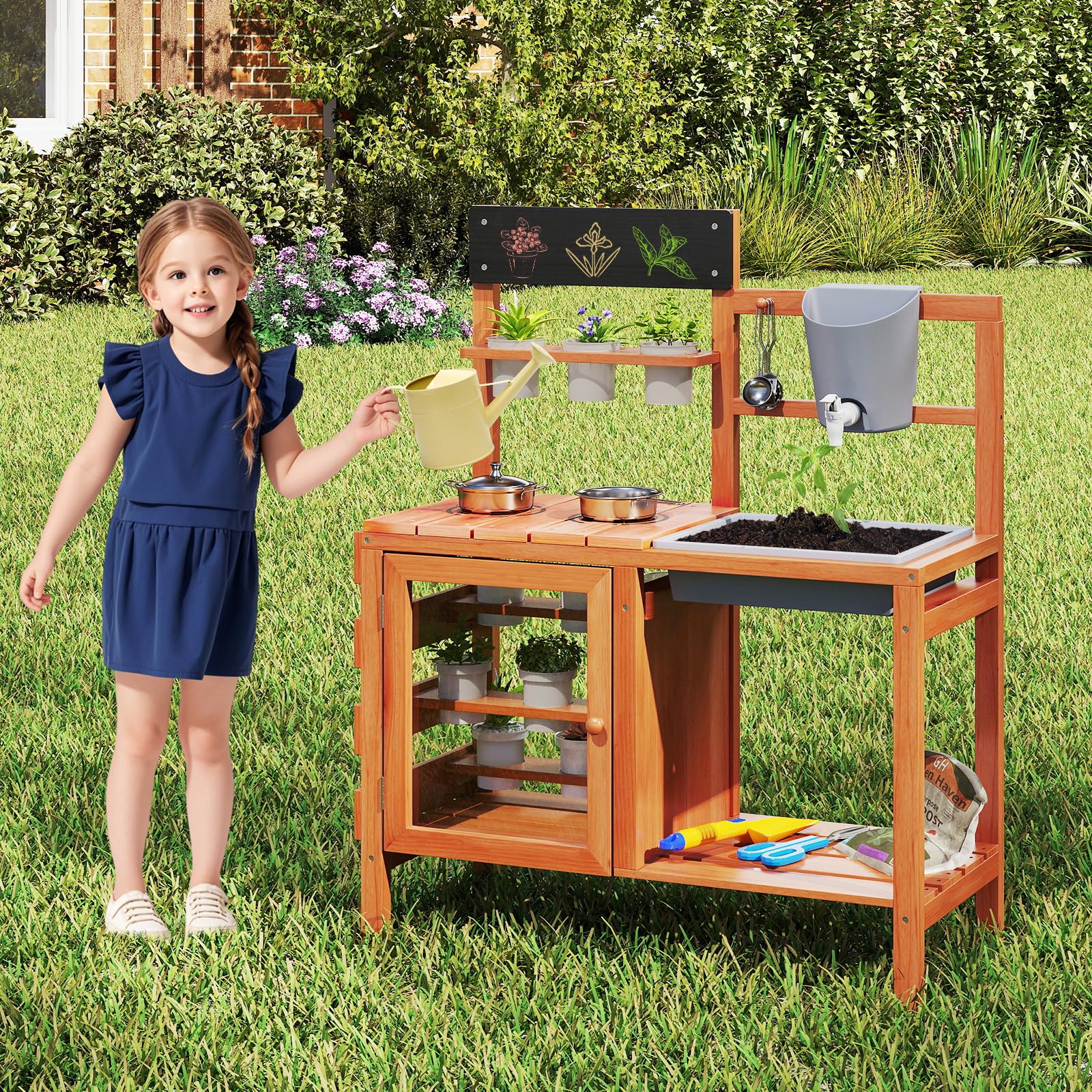 - Multi-functional Accessories: Our outdoor mud kitchen has a removable sink, rotary faucet, 2 stoves, 5 piece pot set, and 3 clear cups that double as paint cups and planters. The larger table gives the children plenty of room to play.