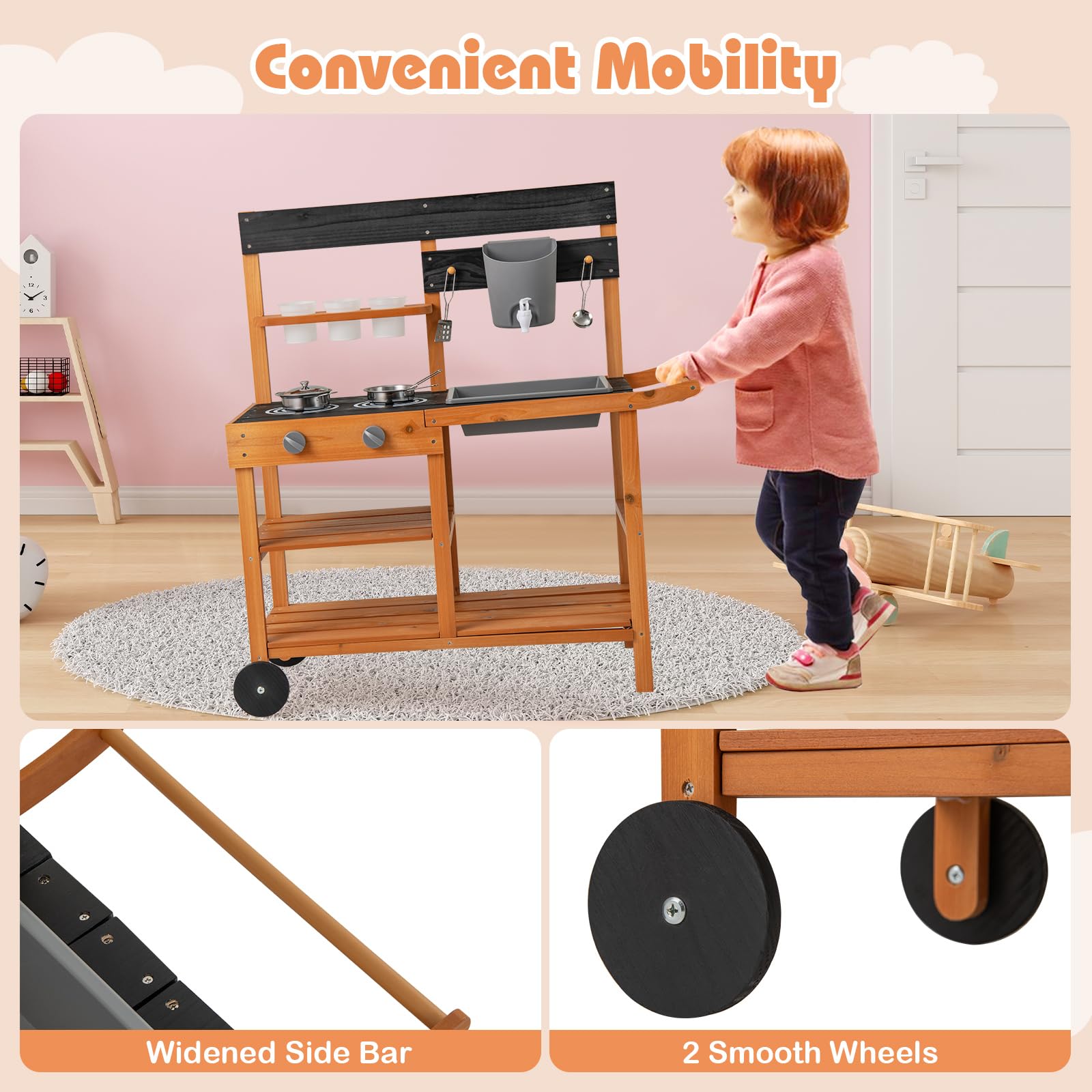 - Great Outdoor Mud Kitchen: OLAKIDS mud kitchen is super versatile and includes realistic faucets, detachable sinks, stoves, cooking accessories, planters and sprinklers, and oversized storage space. Children can play imaginative games while learning about food preparation and kitchen chores. In addition, this children's outdoor mud kitchen comes with two wheels and handrails for easy movement.