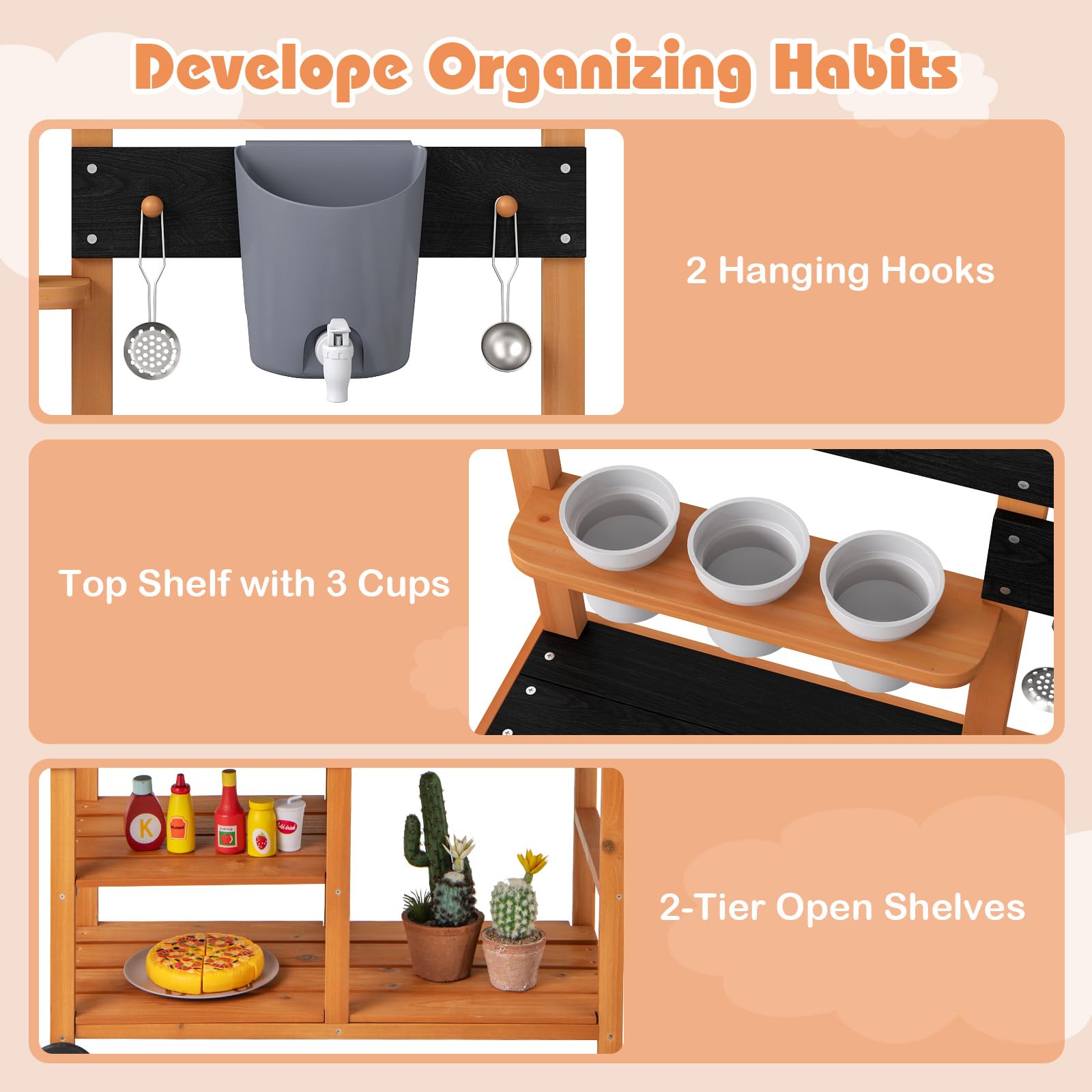 - Premium Quality & Safe for Kids to Play: Made from premium wood and water based paints, BPA free. This wooden pretend outdoor mud kitchen playset is fully compliant with the requirements of the U.S. ASTMF-963 and CPSIA safety standard for physical and chemical safety testing. Besides, smooth rounded corners provide better protection, effectively preventing children from scratching and bumping.