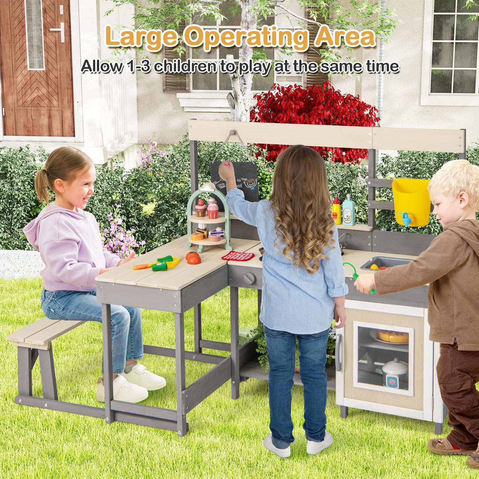 - Play Under the Sun: OLAKIDS outdoor mud kitchen has a removable sink, swivel faucet, 4 stoves, 4 pots, chalkboard and dessert counter. Larger tables give kids plenty of room to play. Unlike other outdoor play kitchen, this upgraded kids kitchen can accommodate up to 3 children at the same time.