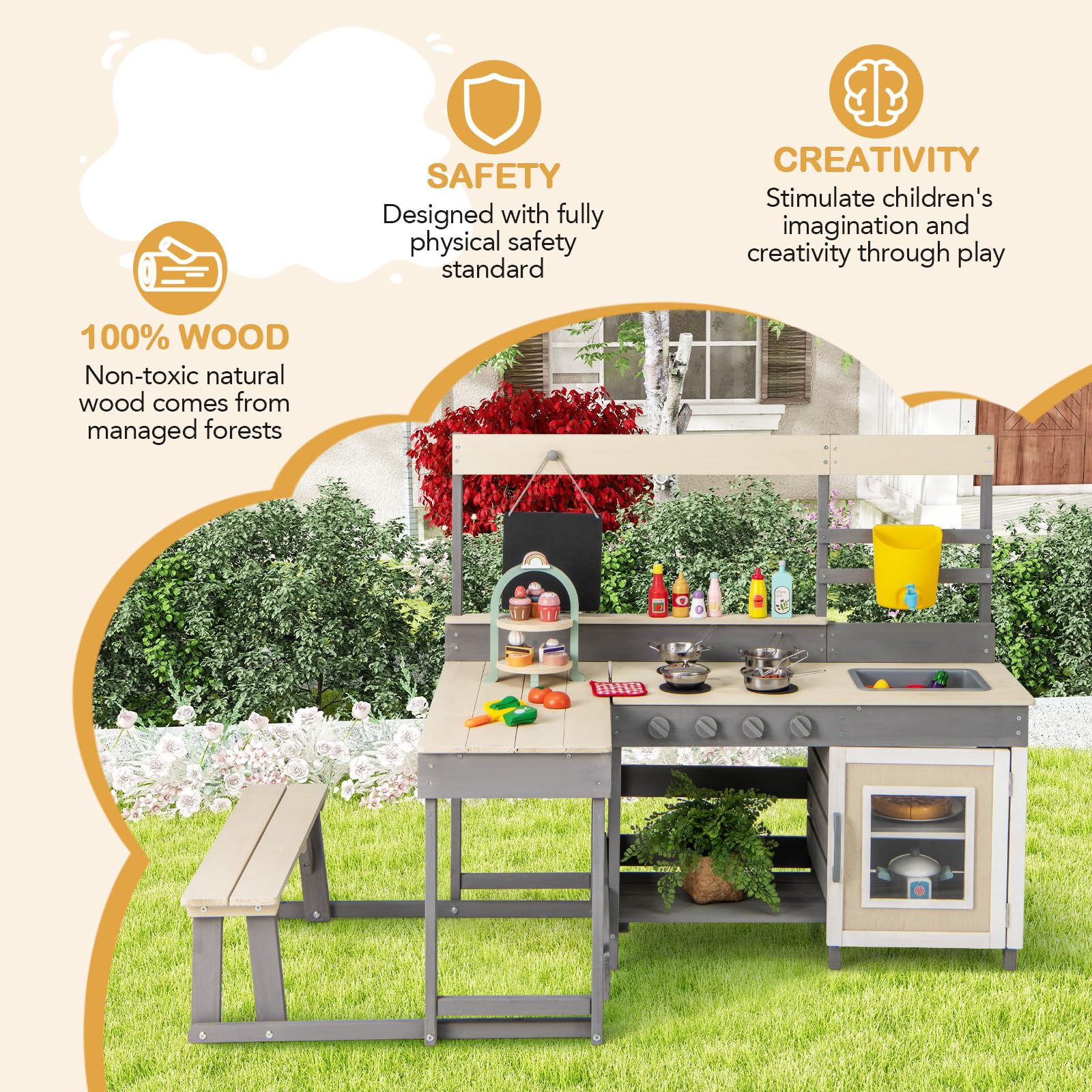 - Premium Quality & Safe for Kids to Play: Made from premium wood and water based paints, BPA free. This wooden pretend outdoor mud kitchen playset is fully compliant with the requirements of the U.S. ASTMF-963 and CPSIA safety standard for physical and chemical safety testing. Besides, smooth rounded corners provide better protection, effectively preventing children from scratching and bumping.