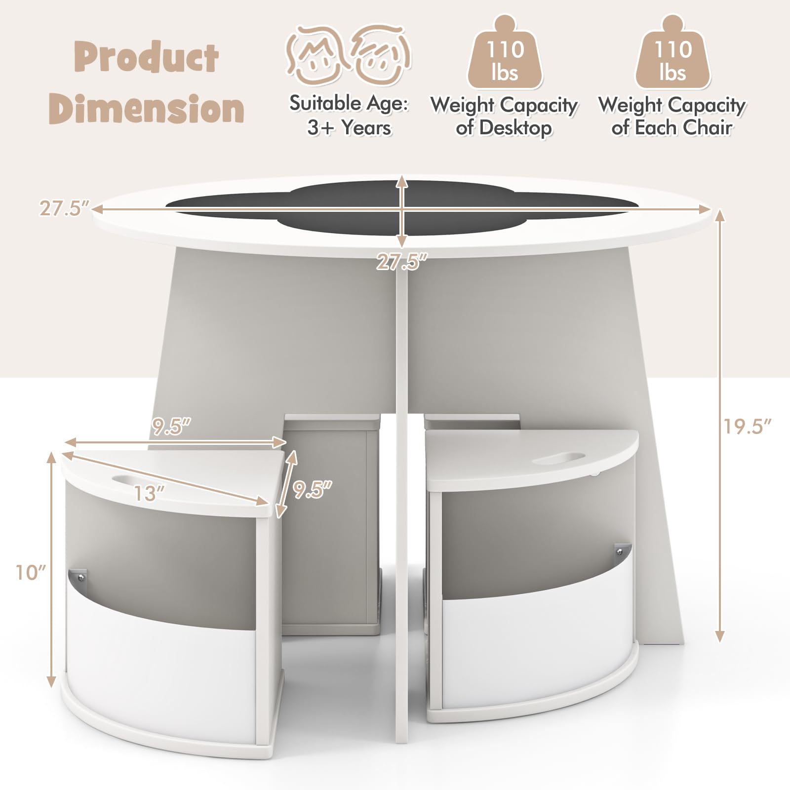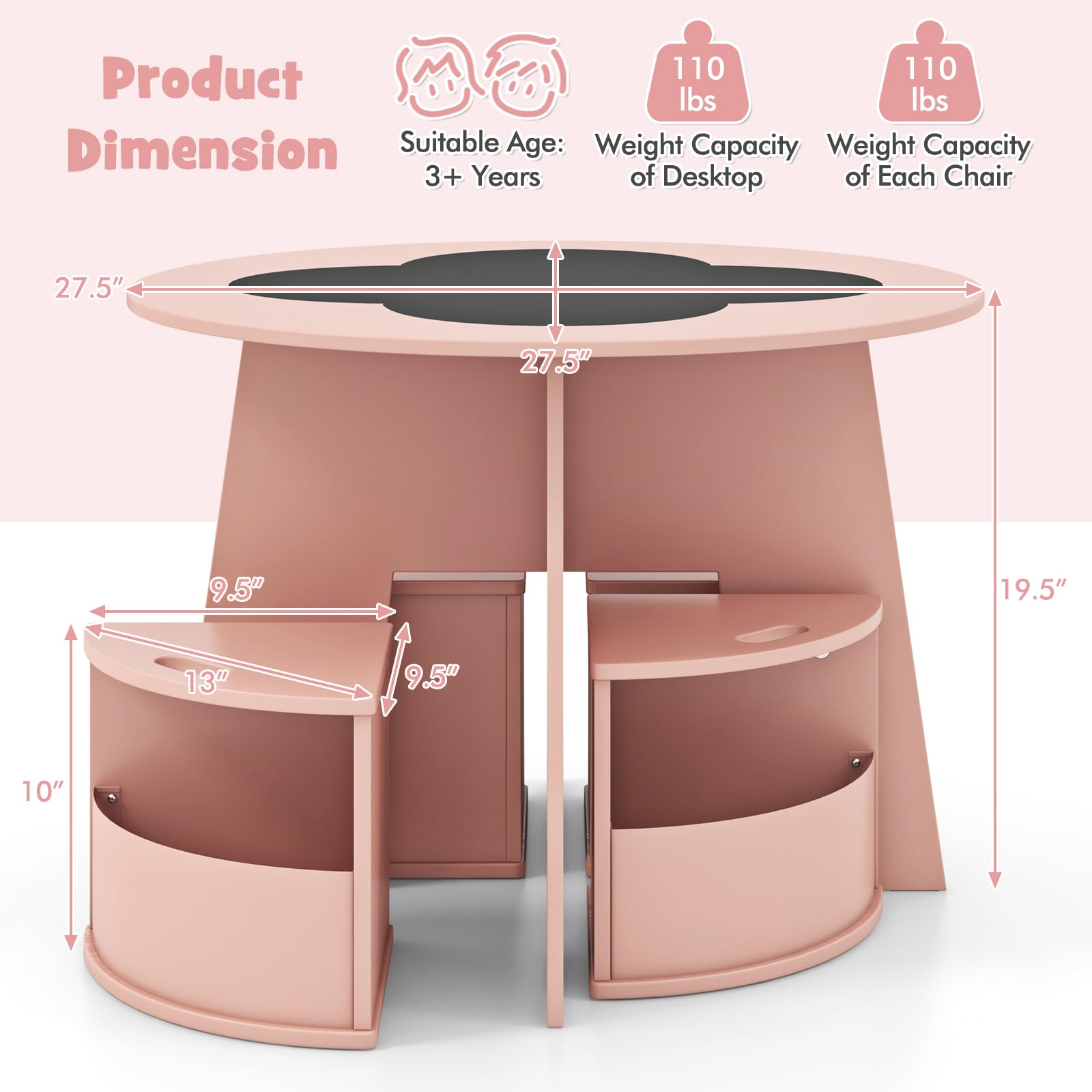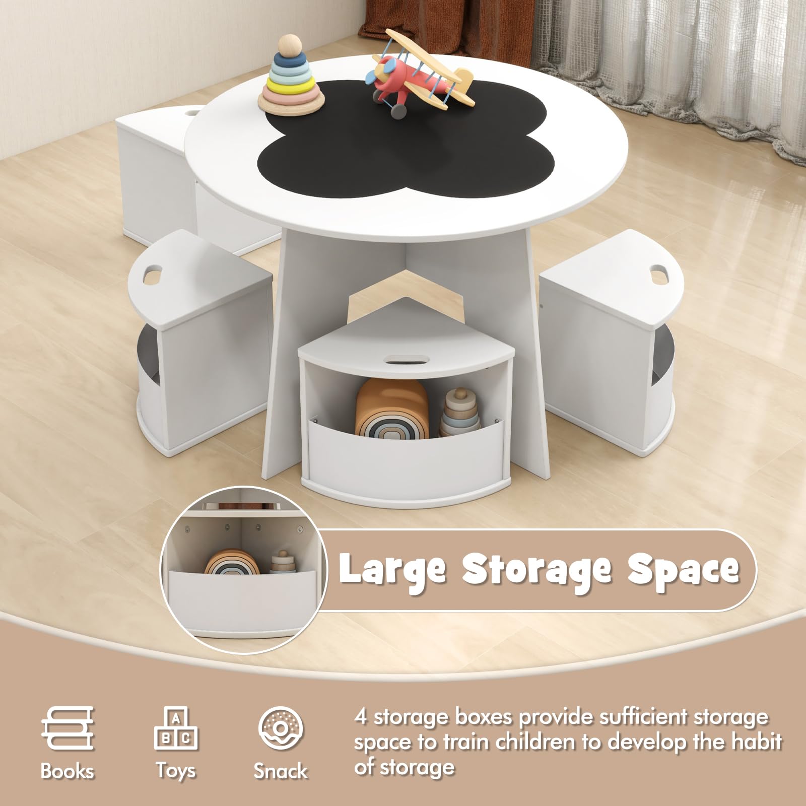 OLAKIDS Toddler Table and Chair Set with 4 Storage Stools, Wooden Flower Shaped Nesting Table with Blackboard Drawers