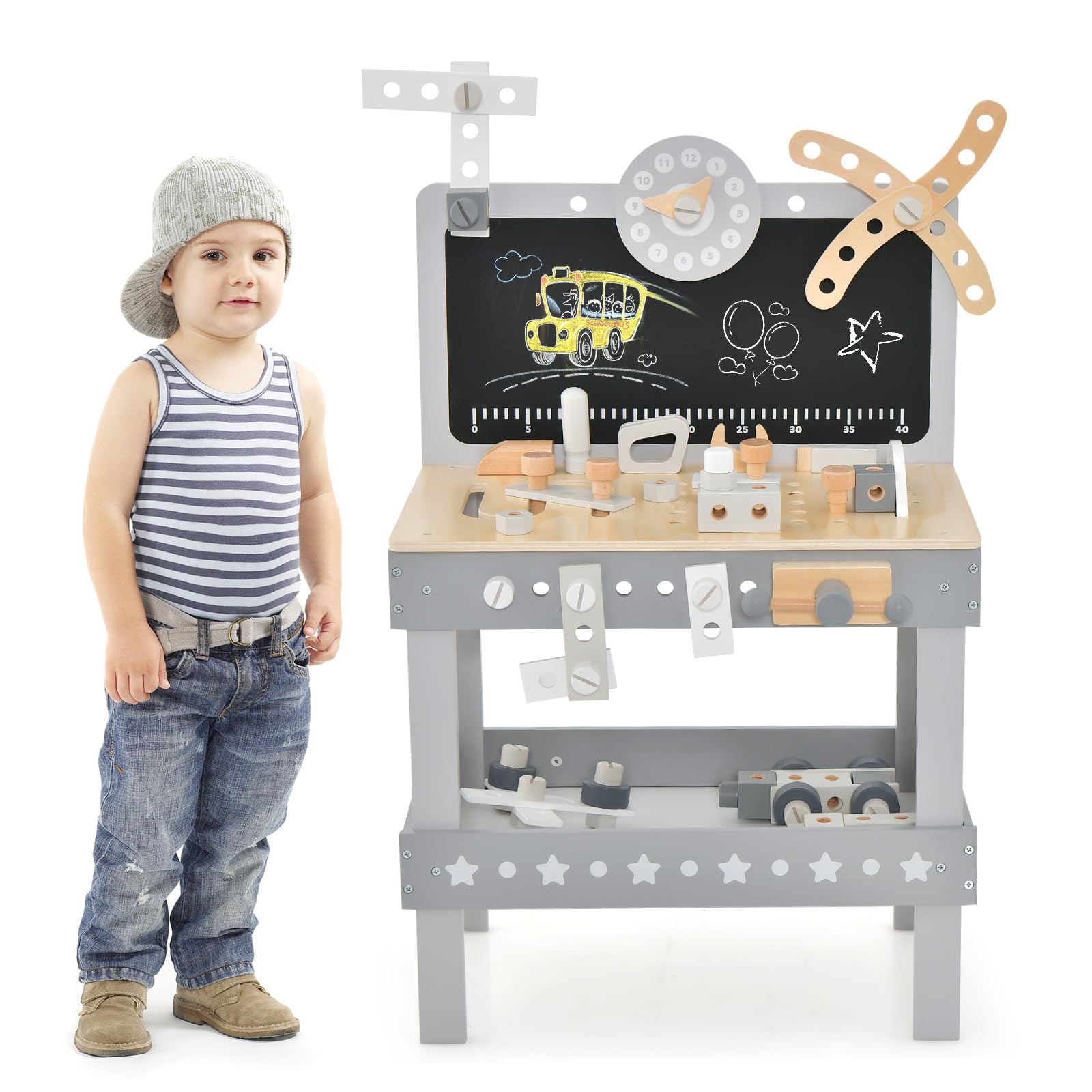 - 💖Realistic Play Workbench: OLAKIDS wooden tool bench for kids includes a variety of simulated wooden tools and 62 parts. Meet the diverse needs of the little engineer, such as hammering nails, screwing screws, using wrenches, measuring dimensions, sawing wood, starting tools and rotating gears. With the included chalkboard, child can write messages while taking a break from construction.