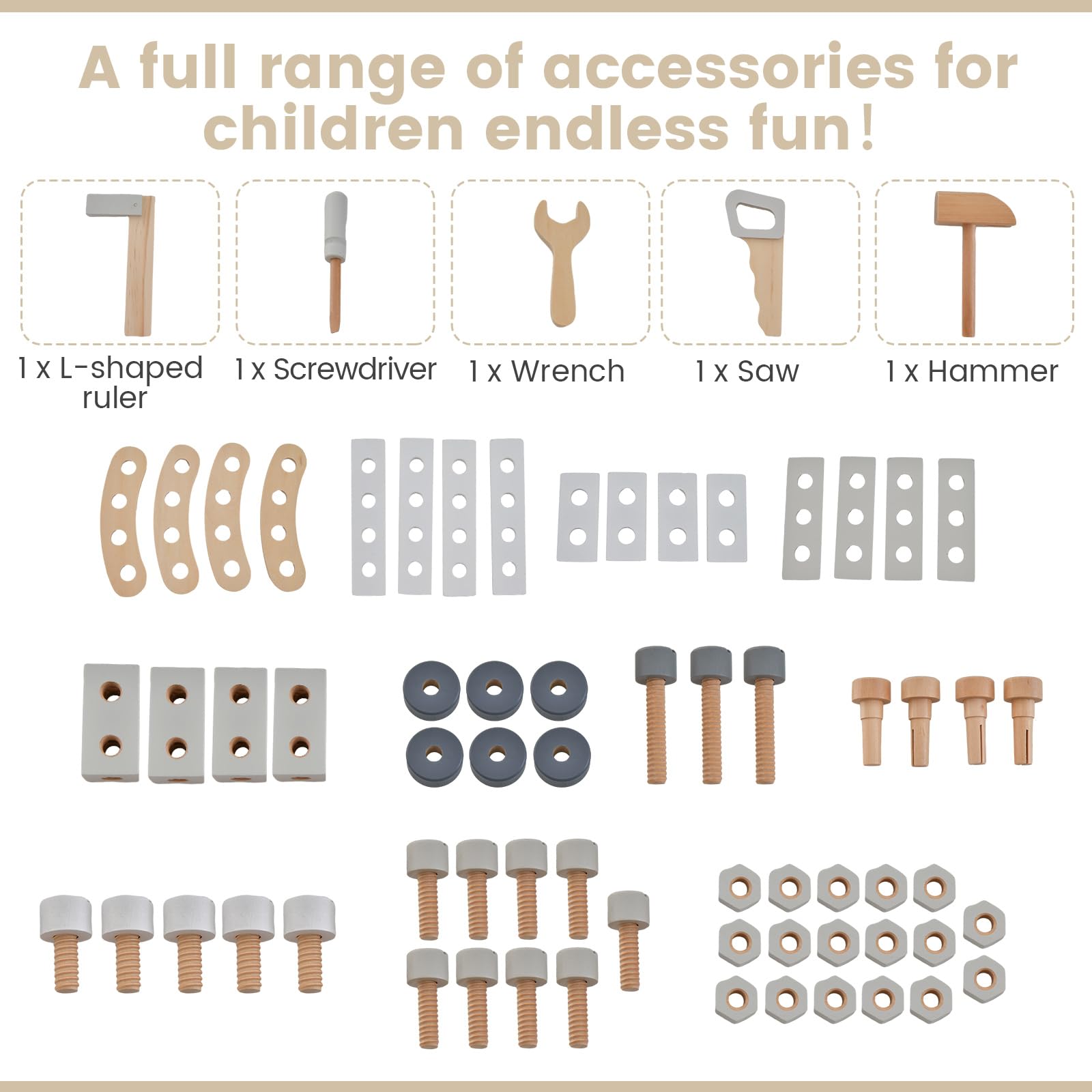 Introducing the ultimate children's pretend play tool bench - a world of imagination and creativity awaits! With its functional tiger clamp, blackboard, and six wooden tools, this set is designed to captivate child's minds. Meet the diverse needs of the little engineer, such as hammering nails, screwing screws, using wrenches, measuring dimensions, sawing wood, starting tools and rotating gears. A wealth of accessories allows children to make different models like windmills, trains and helicopters. Not just a toy, but an educational experience! Encourage role-playing and teamwork as your little one becomes a master builder. Suitable for both boys and girls, this activity kids construction toy building set is the perfect gift for endless fun and learning.